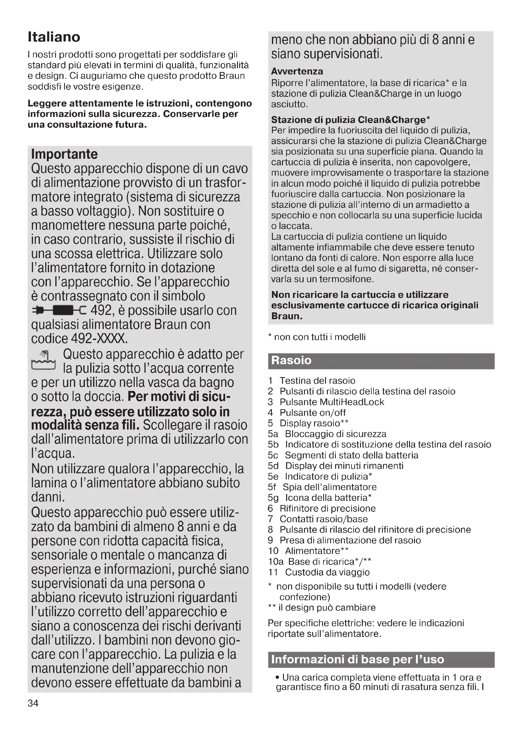 Aumento do consumo de líquido de limpeza. O dreno do Centro Clean&Charge está entupido. – Limpe o dreno com um palito de madeira. – Limpe regularmente o recipiente. Garantia Braun concede a este produto 2 anos de garantia a partir da data de compra. Dentro do período de garantia qualquer defeito do aparelho, devido aos materiais ou ao seu fabrico, será reparado, substituindo peças ou trocando por um aparelho novo segundo o nosso critério, sem qualquer custo. A garantia não cobre avarias por: utilização indevida, funcionamento a voltagem diferente da indicada, ligação a uma tomada de corrente elétrica incorreta, rutura, utilização ou desgaste normal, defeitos que têm um efeito insignificante no valor ou no funcionamento do produto. A garantia perderá o seu efeito no caso de serem efetuadas reparações por pessoas não autorizadas ou se não forem utilizados acessórios originais Braun. A garantia só é válida se a data de compra fôr confirmada pela apresentação da fatura ou documento de compra correspondente. Esta garantia é válida para todos os países onde este produto seja distribuído por Braun ou por um distribuidor Braun autorizado. No caso de reclamação ao abrigo de garantia, dirija-se ao Serviço de Assistência Técnica Oficial Braun mais próximo: www.service.braun.com. Só para Portugal Apoio ao consumidor: Para localizar o seu Serviço Braun mais próximo o no caso de surgir alguma dúvida relativamente ao funcionamiento deste produto, contacte por favor este serviço pelo telefone 808 20 00 33. 91611492_93XXcc_W&D_MN_Type_5793_S6-76.indd 3391611492_93XXcc_W&D_MN_Type_5793_S6-76.indd 33 20.10.17 08:1620.10.17 08:16 CSS APPROVED Effective Date 23Oct2017 GMT - Printed 22Nov2017 Page 33 of 7634 Italiano I nostri prodotti sono progettati per soddisfare gli standard più elevati in termini di qualità, funzionalità e design. Ci auguriamo che questo prodotto Braun soddisfi le vostre esigenze. Leggere attentamente le istruzioni, contengono informazioni sulla sicurezza. Conservarle per una consultazione futura. Importante Questo apparecchio dispone di un cavo di alimentazione provvisto di un trasfor- matore integrato (sistema di sicurezza a basso voltaggio). Non sostituire o manomettere nessuna parte poiché, in caso contrario, sussiste il rischio di una scossa elettrica. Utilizzare solo l’alimentatore fornito in dotazione con l’apparecchio. Se l’apparecchio è contrassegnato con il simbolo 492, è possibile usarlo con qualsiasi alimentatore Braun con codice 492-XXXX. Questo apparecchio è adatto per la pulizia sotto l’acqua corrente e per un utilizzo nella vasca da bagno o sotto la doccia. Per motivi di sicu- rezza, può essere utilizzato solo in modalità senza fili. Scollegare il rasoio dall’alimentatore prima di utilizzarlo con l’acqua. Non utilizzare qualora l’apparecchio, la lamina o l’alimentatore abbiano subito danni. Questo apparecchio può essere utiliz- zato da bambini di almeno 8 anni e da persone con ridotta capacità fisica, sensoriale o mentale o mancanza di esperienza e informazioni, purché siano supervisionati da una persona o abbiano ricevuto istruzioni riguardanti l’utilizzo corretto dell’apparecchio e siano a conoscenza dei rischi derivanti dall’utilizzo. I bambini non devono gio- care con l’apparecchio. La pulizia e la manutenzione dell’apparecchio non devono essere effettuate da bambini a meno che non abbiano più di 8 anni e siano supervisionati. Avvertenza Riporre l’alimentatore, la base di ricarica* e la stazione di pulizia Clean&Charge in un luogo asciutto. Stazione di pulizia Clean&Charge* Per impedire la fuoriuscita del liquido di pulizia, assicurarsi che la stazione di pulizia Clean&Charge sia posizionata su una superficie piana. Quando la cartuccia di pulizia è inserita, non capovolgere, muovere improvvisamente o trasportare la stazione in alcun modo poiché il liquido di pulizia potrebbe fuoriuscire dalla cartuccia. Non posizionare la stazione di pulizia all’interno di un armadietto a specchio e non collocarla su una superficie lucida o laccata. La cartuccia di pulizia contiene un liquido altamente infiammabile che deve essere tenuto lontano da fonti di calore. Non esporre alla luce diretta del sole e al fumo di sigaretta, né conser- varla su un termosifone. Non ricaricare la cartuccia e utilizzare esclusivamente cartucce di ricarica originali Braun.
