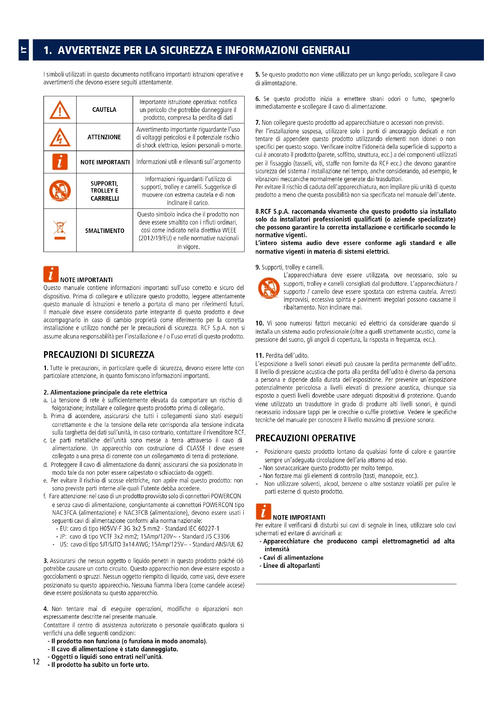Informazioni riguardanti l’utilizzo di supporti, trolley e carrelli. Suggerisce di muovere con estrema cautela e di non inclinare il carico. SMALTIMENTO Questo simbolo indica che il prodotto non deve essere smaltito con i rifiuti ordinari, così come indicato nella direttiva WEEE (2012/19/EU) e nelle normative nazionali in vigore. NOTE IMPORTANTI Questo manuale contiene informazioni importanti sull’uso corretto e sicuro del dispositivo. Prima di collegare e utilizzare questo prodotto, leggere attentamente questo manuale di istruzioni e tenerlo a portata di mano per riferimenti futuri. Il manuale deve essere considerato parte integrante di questo prodotto e deve accompagnarlo in caso di cambio proprietà come riferimento per la corretta installazione e utilizzo nonché per le precauzioni di sicurezza. RCF S.p.A. non si assume alcuna responsabilità per l’installazione e / o l’uso errati di questo prodotto.
