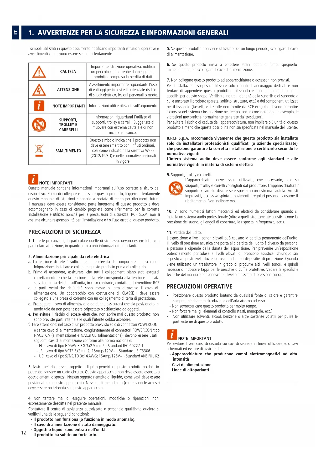Informazioni riguardanti l’utilizzo di supporti, trolley e carrelli. Suggerisce di muovere con estrema cautela e di non inclinare il carico. SMALTIMENTO Questo simbolo indica che il prodotto non deve essere smaltito con i rifiuti ordinari, così come indicato nella direttiva WEEE (2012/19/EU) e nelle normative nazionali in vigore. NOTE IMPORTANTI Questo manuale contiene informazioni importanti sull’uso corretto e sicuro del dispositivo. Prima di collegare e utilizzare questo prodotto, leggere attentamente questo manuale di istruzioni e tenerlo a portata di mano per riferimenti futuri. Il manuale deve essere considerato parte integrante di questo prodotto e deve accompagnarlo in caso di cambio proprietà come riferimento per la corretta installazione e utilizzo nonché per le precauzioni di sicurezza. RCF S.p.A. non si assume alcuna responsabilità per l’installazione e / o l’uso errati di questo prodotto.