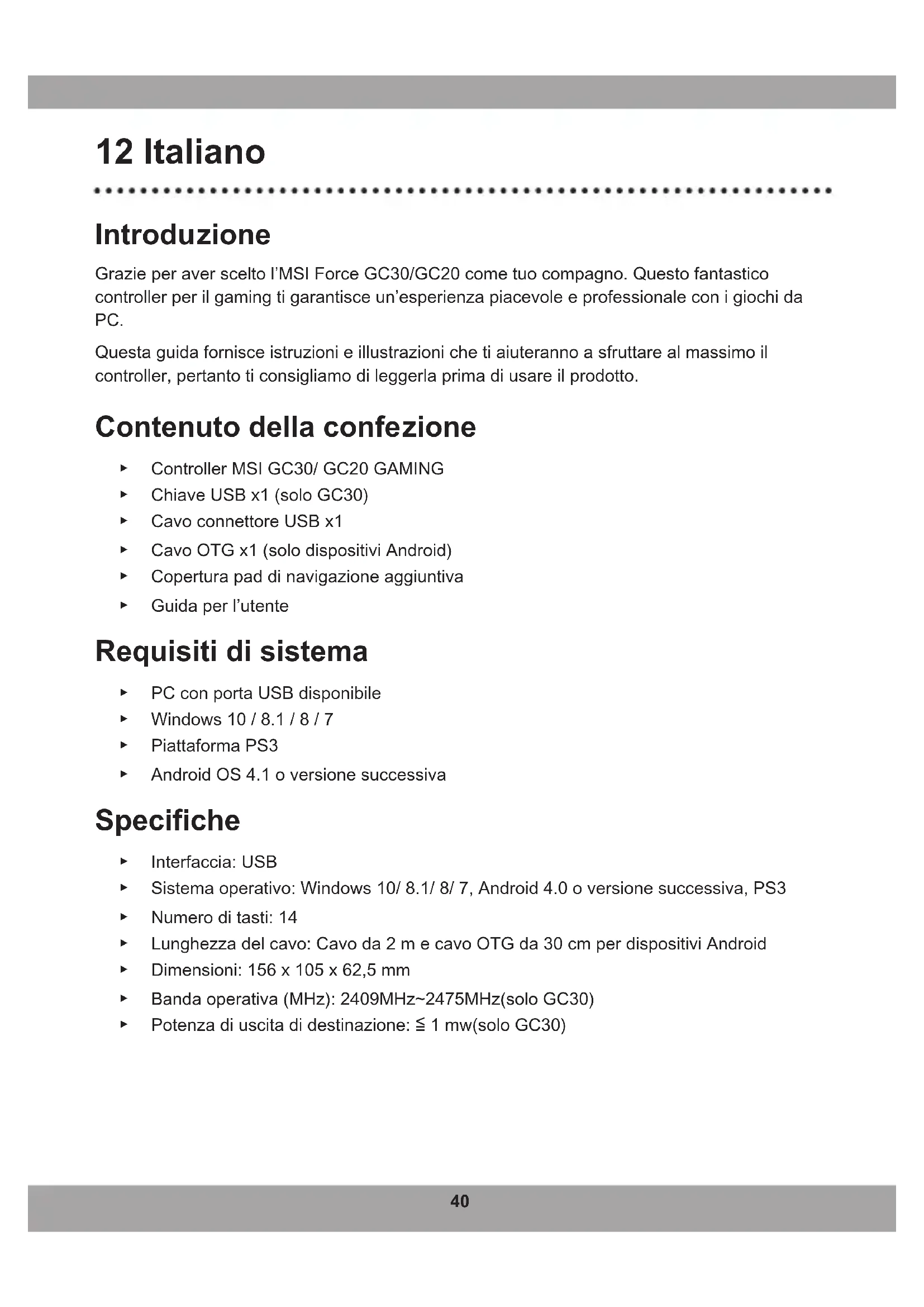 - Jeżelizostaniewybranytentryb,włączonybędzietrzeci(3)iczwarty(4)wskaźnik trybu.40 12 Italiano Introduzione Grazie per aver scelto l’MSI Force GC30/GC20 come tuo compagno. Questo fantastico controller per il gaming ti garantisce un’esperienza piacevole e professionale con i giochi da PC. Questa guida fornisce istruzioni e illustrazioni che ti aiuteranno a sfruttare al massimo il controller, pertanto ti consigliamo di leggerla prima di usare il prodotto. Contenuto della confezione ▶ Controller MSI GC30/ GC20 GAMING ▶ Chiave USB x1 (solo GC30) ▶ Cavo connettore USB x1 ▶ Cavo OTG x1 (solo dispositivi Android) ▶ Copertura pad di navigazione aggiuntiva ▶ Guida per l’utente Requisiti di sistema ▶ PC con porta USB disponibile ▶ Windows 10 / 8.1 / 8 / 7 ▶ Piattaforma PS3 ▶ Android OS 4.1 o versione successiva Specifiche ▶ Interfaccia: USB ▶ Sistema operativo: Windows 10/ 8.1/ 8/ 7, Android 4.0 o versione successiva, PS3 ▶ Numero di tasti: 14 ▶ Lunghezza del cavo: Cavo da 2 m e cavo OTG da 30 cm per dispositivi Android ▶ Dimensioni: 156 x 105 x 62,5 mm ▶ Banda operativa (MHz): 2409MHz~2475MHz(solo GC30) ▶ Potenzadiuscitadidestinazione:≦1mw(soloGC30)41 Descrizione