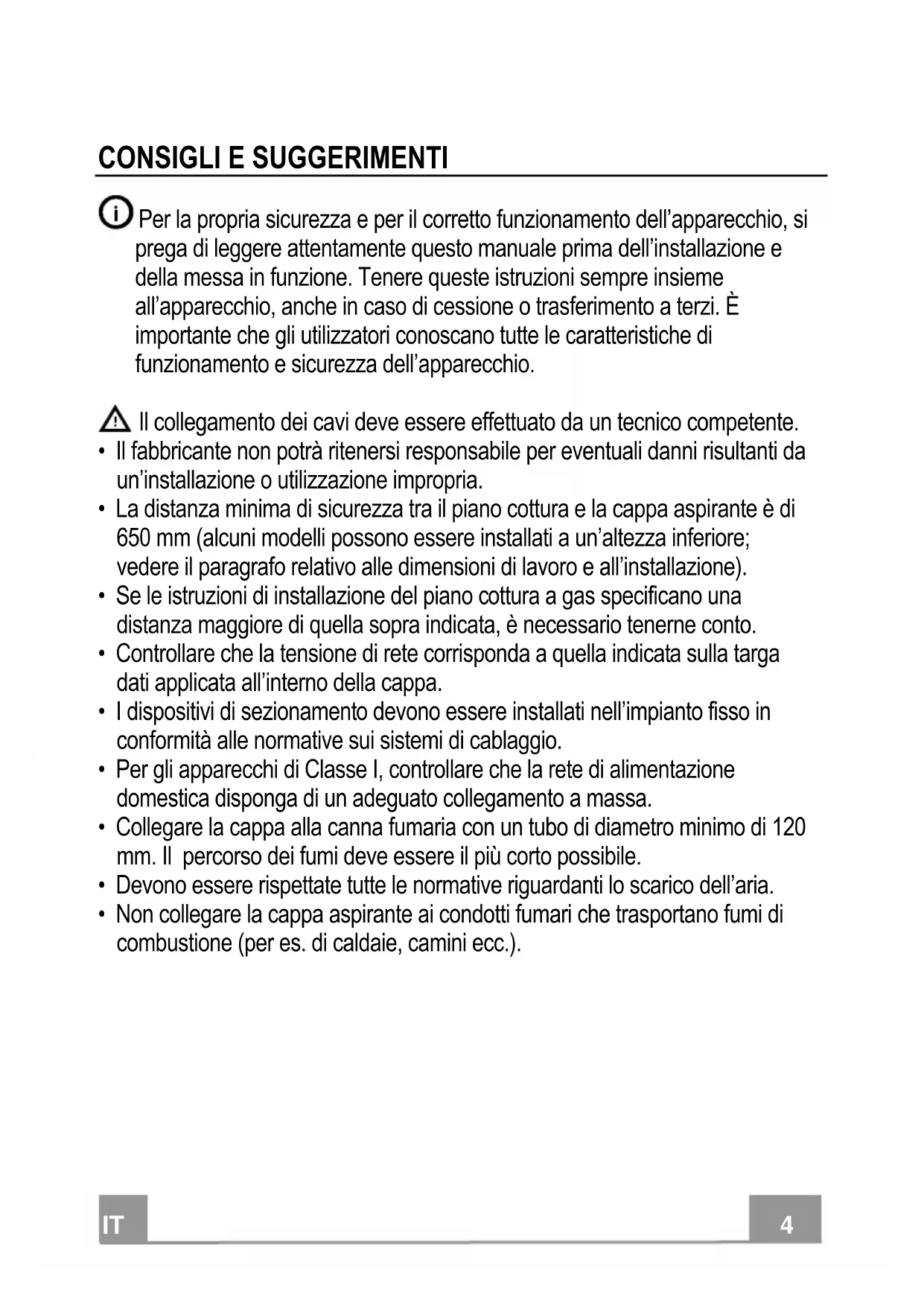 - Non collegare la cappa aspirante ai condotti fumari che trasportano fumi di combustione (per es. di caldaie, camini ecc.).IT