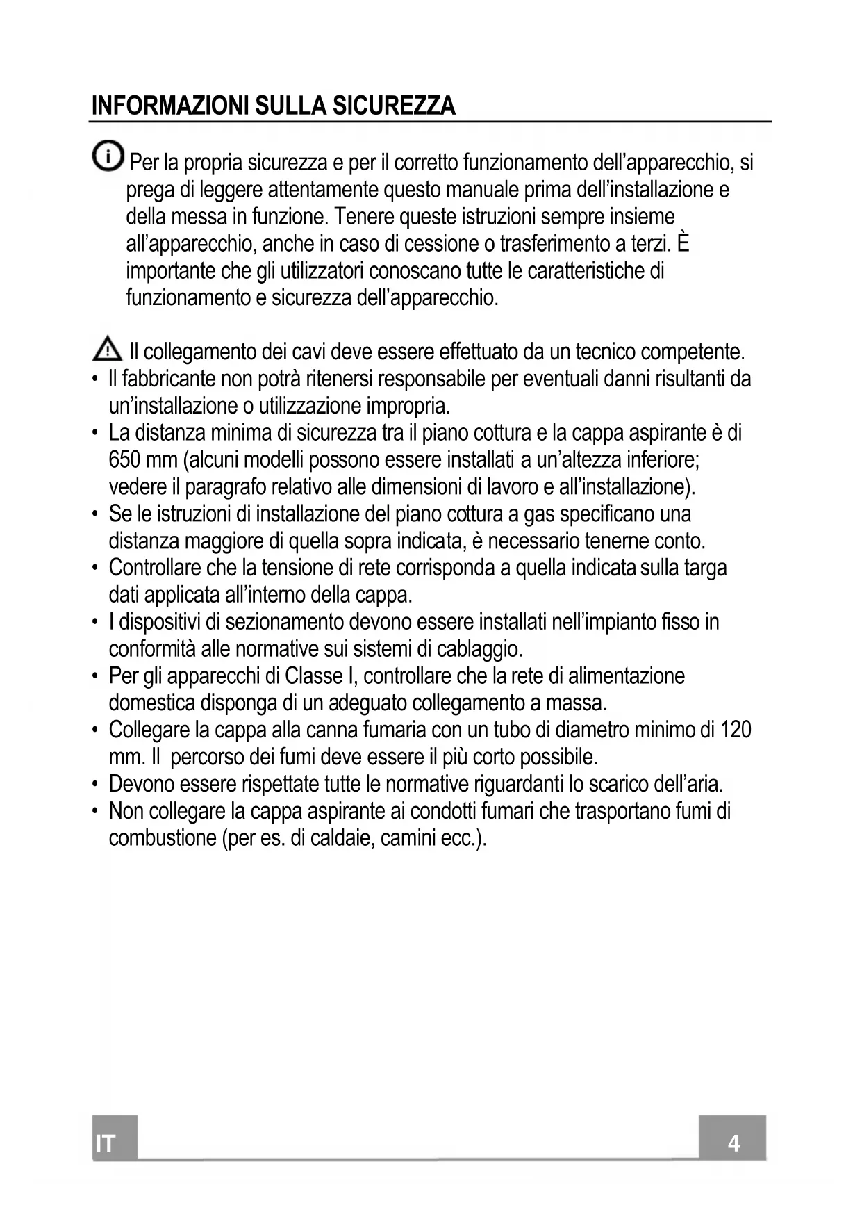 Non collegare la cappa aspirante ai condotti fumari che trasportano fu mi di combustione (per es. di caldaie, cam ini ecc.).IT