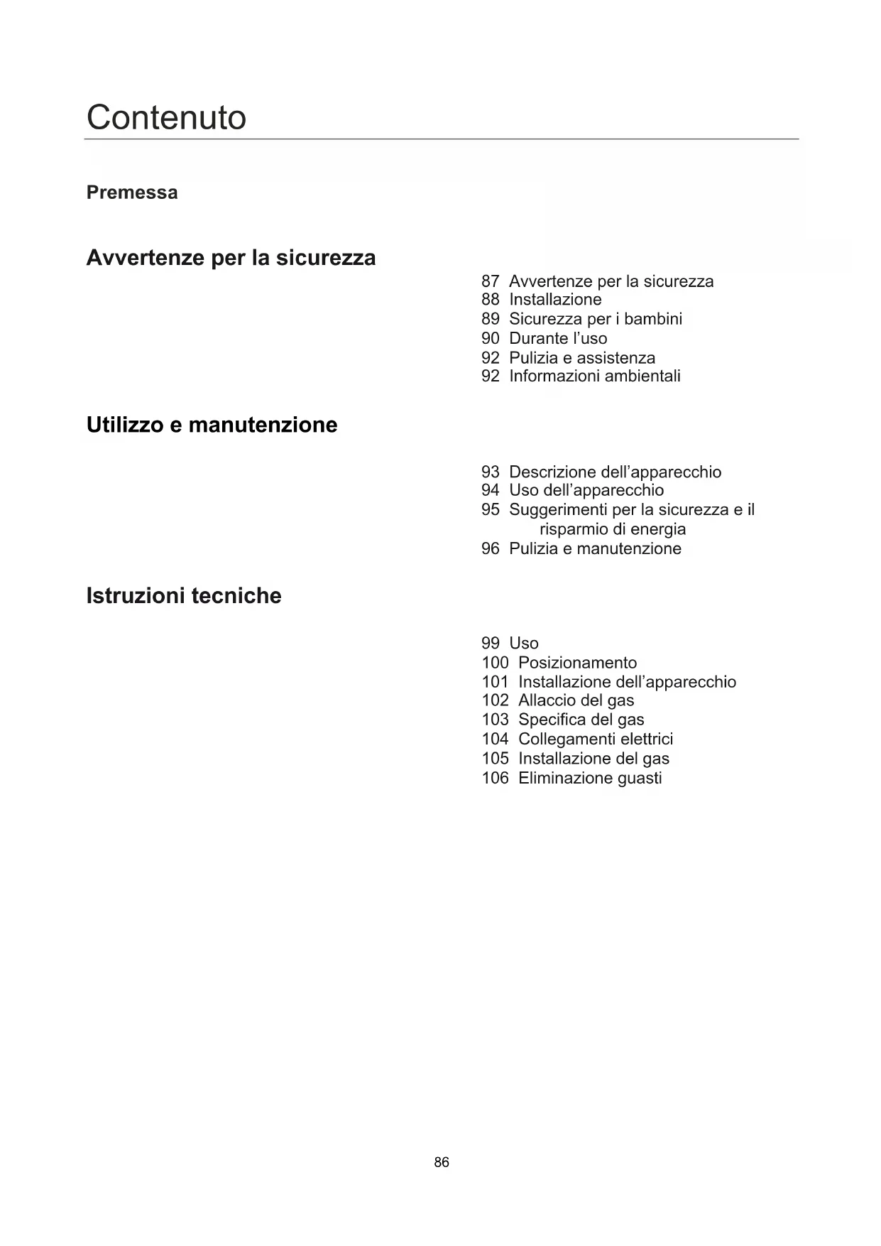 ■ Wanneer het probleem niet kon worden opgelost, neemt u contact op met de klantenservice.86 Contenuto Premessa Avvertenze per la sicurezza 87 Avvertenze per la sicurezza 88 Installazione 89 Sicurezza per i bambini 90 Durante l’uso 92 Pulizia e assistenza 92 Informazioni ambientali Utilizzo e manutenzione 93 Descrizione dell’apparecchio 94 Uso dell’apparecchio 95 Suggerimenti per la sicurezza e il risparmio di energia 96 Pulizia e manutenzione Istruzioni tecniche 99 Uso 100 Posizionamento 101 Installazione dell’apparecchio 102 Allaccio del gas 103 Specifica del gas 104 Collegamenti elettrici 105 Installazione del gas 106 Eliminazione guasti87 Avvertenze per la sicurezza ■ Leggere le presenti istruzioni per l’uso prima di installare o utilizzare l’apparecchio. ■ Le presenti istruzioni per l’uso vanno conservate per eventuali richieste future. Se l’apparecchio viene venduto o consegnato ad un’altra persona, anche le presenti istruzioni per l’uso vanno consegnate al nuovo utente. ■ Il fabbricante declina qualsiasi responsabilità per l’inosservanza di tali misure di sicurezza. ■ Le seguenti avvertenze sono strutturate in modo da essere facilmente comprensibili, al fine di evitare infortuni dovuti ad un abuso e per consentire un uso confortevole dell’apparecchio. ■ Leggere attentamente i seguenti capitoli.