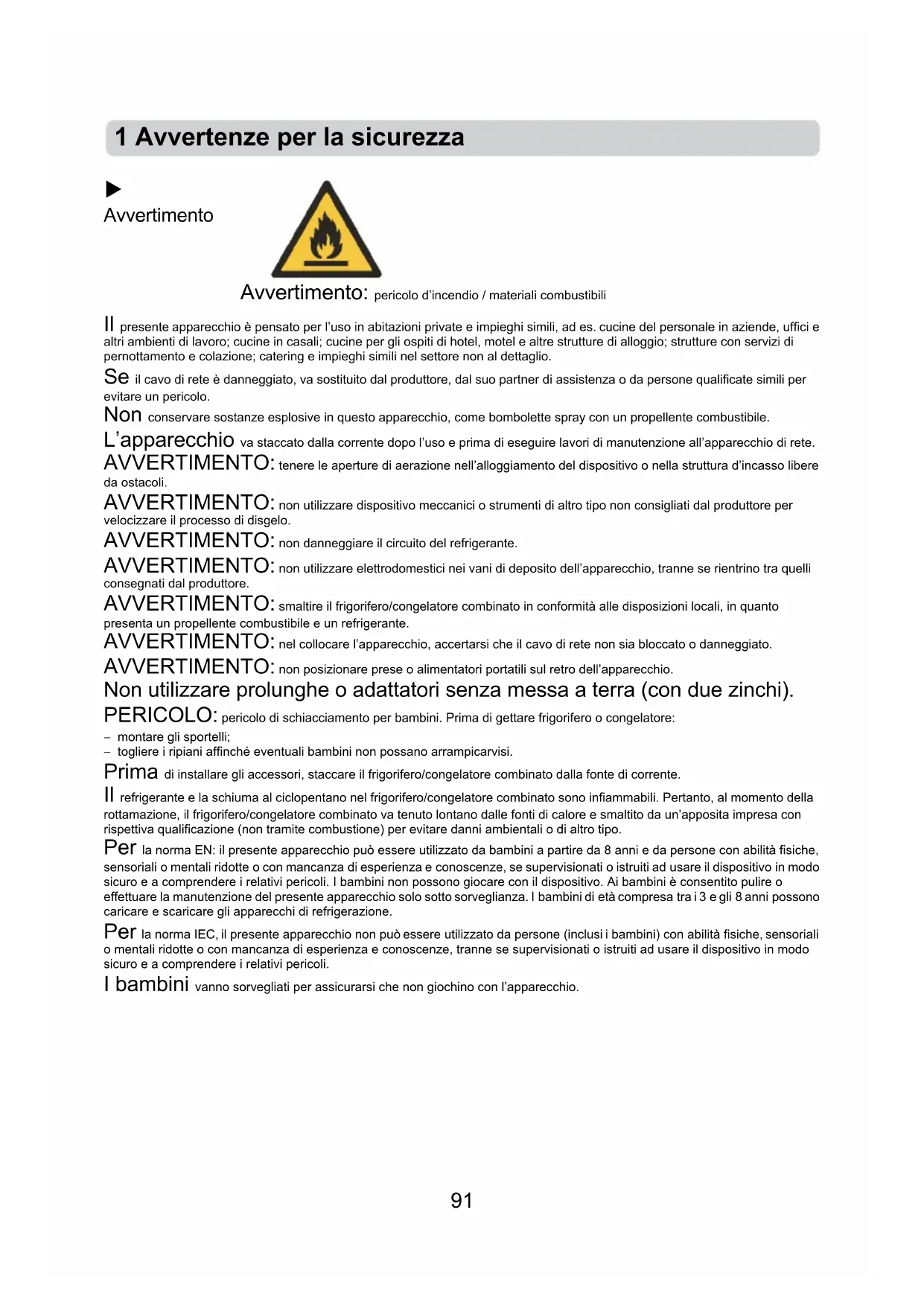 Avvertimento: pericolo d’incendio / materiali combustibili Il presente apparecchio è pensato per l’uso in abitazioni private e impieghi simili, ad es. cucine del personale in aziende, uffici e altri ambienti di lavoro; cucine in casali; cucine per gli ospiti di hotel, motel e altre strutture di alloggio; strutture con servizi di pernottamento e colazione; catering e impieghi simili nel settore non al dettaglio. Se il cavo di rete è danneggiato, va sostituito dal produttore, dal suo partner di assistenza o da persone qualificate simili per evitare un pericolo. Non conservare sostanze esplosive in questo apparecchio, come bombolette spray con un propellente combustibile. L’apparecchio va staccato dalla corrente dopo l’uso e prima di eseguire lavori di manutenzione all’apparecchio di rete. AVVERTIMENTO: tenere le aperture di aerazione nell’alloggiamento del dispositivo o nella struttura d’incasso libere da ostacoli. AVVERTIMENTO: non utilizzare dispositivo meccanici o strumenti di altro tipo non consigliati dal produttore per velocizzare il processo di disgelo. AVVERTIMENTO: non danneggiare il circuito del refrigerante. AVVERTIMENTO: non utilizzare elettrodomestici nei vani di deposito dell’apparecchio, tranne se rientrino tra quelli consegnati dal produttore. AVVERTIMENTO: smaltire il frigorifero/congelatore combinato in conformità alle disposizioni locali, in quanto presenta un propellente combustibile e un refrigerante. AVVERTIMENTO: nel collocare l’apparecchio, accertarsi che il cavo di rete non sia bloccato o danneggiato. AVVERTIMENTO: non posizionare prese o alimentatori portatili sul retro dell’apparecchio. Non utilizzare prolunghe o adattatori senza messa a terra (con due zinchi). PERICOLO: pericolo di schiacciamento per bambini. Prima di gettare frigorifero o congelatore: - montare gli sportelli; - togliere i ripiani affinché eventuali bambini non possano arrampicarvisi. Prima di installare gli accessori, staccare il frigorifero/congelatore combinato dalla fonte di corrente. Il refrigerante e la schiuma al ciclopentano nel frigorifero/congelatore combinato sono infiammabili. Pertanto, al momento della rottamazione, il frigorifero/congelatore combinato va tenuto lontano dalle fonti di calore e smaltito da un’apposita impresa con rispettiva qualificazione (non tramite combustione) per evitare danni ambientali o di altro tipo. Per la norma EN: il presente apparecchio può essere utilizzato da bambini a partire da 8 anni e da persone con abilità fisiche, sensoriali o mentali ridotte o con mancanza di esperienza e conoscenze, se supervisionati o istruiti ad usare il dispositivo in modo sicuro e a comprendere i relativi pericoli. I bambini non possono giocare con il dispositivo. Ai bambini è consentito pulire o effettuare la manutenzione del presente apparecchio solo sotto sorveglianza. I bambini di età compresa tra i 3 e gli 8 anni possono caricare e scaricare gli apparecchi di refrigerazione. Per la norma IEC, il presente apparecchio non può essere utilizzato da persone (inclusi i bambini) con abilità fisiche, sensoriali o mentali ridotte o con mancanza di esperienza e conoscenze, tranne se supervisionati o istruiti ad usare il dispositivo in modo sicuro e a comprendere i relativi pericoli. I bambini vanno sorvegliati per assicurarsi che non giochino con l’apparecchio. 1 Avvertenze per la sicurezza92 Le istruzioni devono includere il contenuto dei seguenti punti. Per evitare una combinazione di alimenti, osservare le seguenti istruzioni: - un’apertura prolungata dello sportello può causare un notevole aumento di temperatura nei ripiani dell’apparecchio. - Pulire regolarmente le superfici che potrebbero venire a contatto con gli alimenti e i sistemi di scarico. - Pulire il serbatoio dell’acqua se non utilizzato per 48 ore. Lavare i sistemi idrici collegati ad un’alimentazione idrica se per 5 giorni di seguito non viene presa acqua. (Avviso 1) - Conservare carne cruda e pesce in appositi contenitori nel frigorifero/congelatore combinato affinché non vengano a contatto con altri alimenti e non gocciolino su questi. - I ripiani del congelatore a due stelle sono adatti alla conservazione di alimenti presurgelati, alla conservazione o alla produzione di crema gelato e di cubetti di ghiaccio. (Avviso 2) - I ripiani a una , due e tre stelle non sono adatti per la refrigerazione di alimenti freschi. (Avviso 3) - Se l’apparecchio di raffreddamento resta vuoto per un periodo di tempo prolungato, spegnerlo, scongelare, pulire, asciugare e lasciare lo sportello aperto per evitare che si formi della muffa all’interno dell’apparecchio. Avviso 1, 2, 3: verificare se ciò sia applicabile in base al tipo di prodotto.93