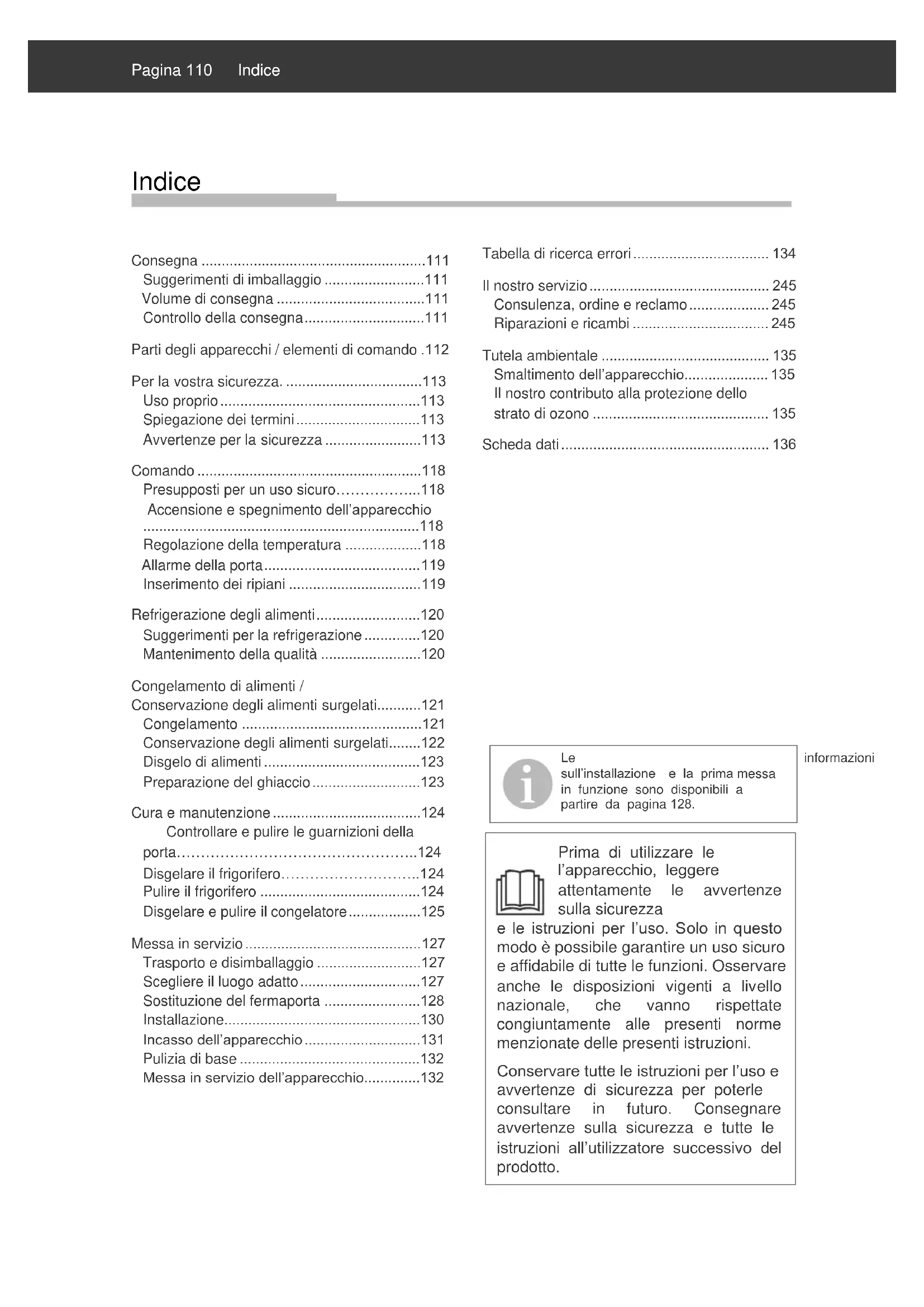 - Scheda dati Le informazioni sull’installazione e la prima messa in funzione sono disponibili a partire da pagina 128. Prima di utilizzare le l’apparecchio, leggere attentamente le avvertenze sulla sicurezza e le istruzioni per l’uso. Solo in questo modo è possibile garantire un uso sicuro e affidabile di tutte le funzioni. Osservare anche le disposizioni vigenti a livello nazionale, che vanno rispettate congiuntamente alle presenti norme menzionate delle presenti istruzioni. Conservare tutte le istruzioni per l’uso e avvertenze di sicurezza per poterle consultare in futuro. Consegnare avvertenze sulla sicurezza e tutte le istruzioni all’utilizzatore successivo del prodotto.Pagina 111 Consegna Consegna Volume di consegna 1 frigorifero da incasso Scomparto frigorifero: 3 cassetti di vetro 1 portabottiglie 1 ripiano di vetro come coperchio per il cassetto per frutta e verdura 1 cassetto per frutta e verdura 3 ripiani della porta Scomparto congelatore: 1 contenitore per i cubetti di ghiaccio 1 portauova 1 raschietto di pulizia 1 istruzioni per l’uso varie parti per il montaggio (vedi “Incasso dell’apparecchio” a pagina 132) Suggerimenti di imballaggio Se le condizioni di spazio lo consentono, è consigliabile conservare la confezione almeno per il periodo della garanzia. Laddove fosse necessario spedire l’apparecchio in riparazione, solo nella sua confezione è sufficientemente protetto. Laddove sia necessario smaltire la confezione, farlo nel rispetto dell’ambiente. Controllo della consegna p. 136