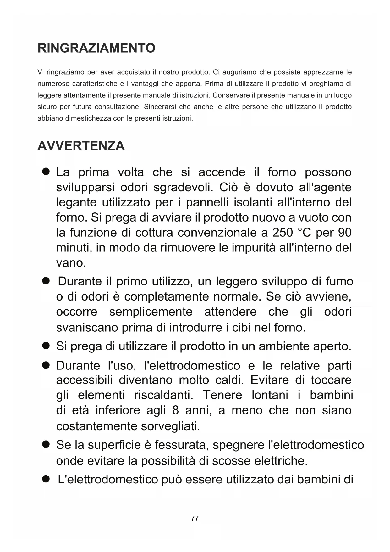 La prima volta che si accende il forno possono svilupparsi odori sgradevoli. Ciò è dovuto all'agente legante utilizzato per i pannelli isolanti all'interno del forno. Si prega di avviare il prodotto nuovo a vuoto con la funzione di cottura convenzionale a 250 °C per 90 minuti, in modo da rimuovere le impurità all'interno del vano. Durante il primo utilizzo, un leggero sviluppo di fumo o di odori è completamente normale. Se ciò avviene, occorre semplicemente attendere che gli odori svaniscano prima di introdurre i cibi nel forno.