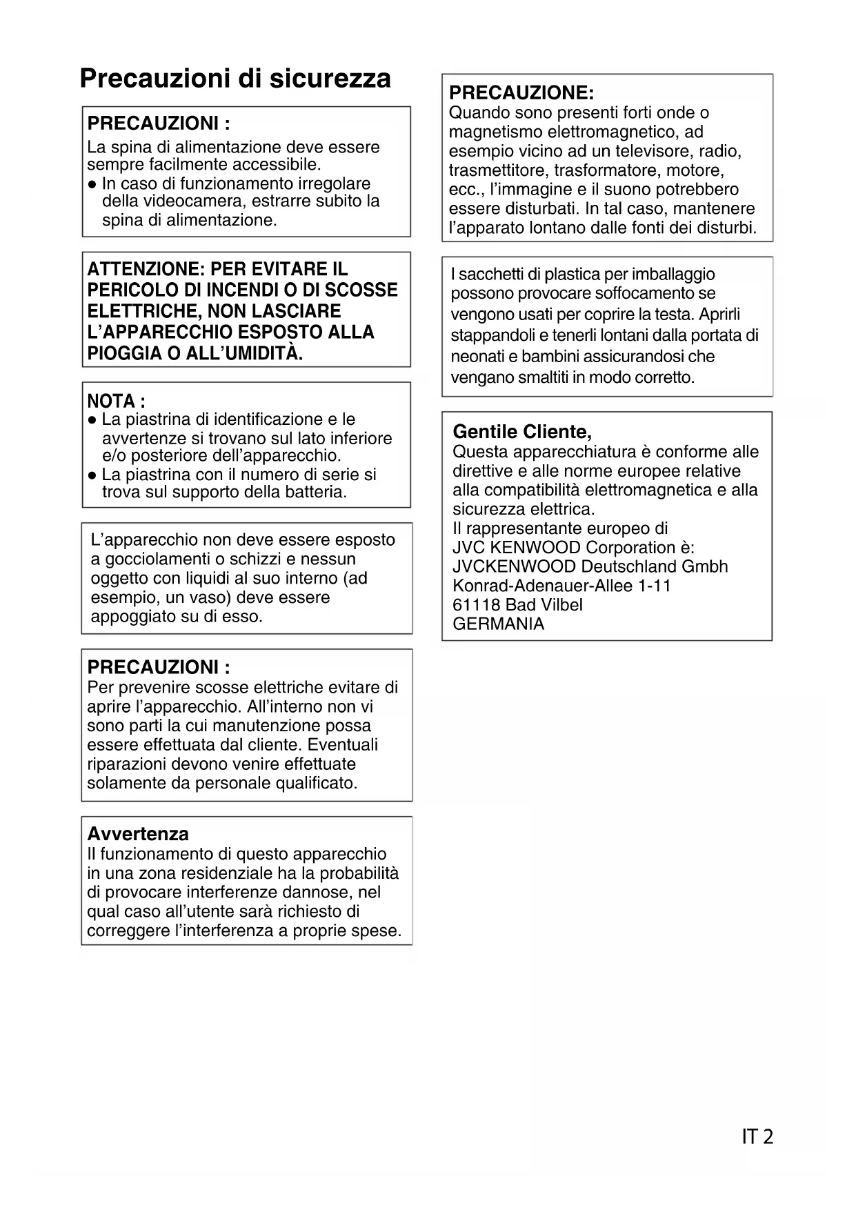 Gentile Cliente, Questa apparecchiatura è conforme alle direttive e alle norme europee relative alla compatibilità elettromagnetica e alla sicurezza elettrica. Il rappresentante europeo di JVC KENWOOD Corporation è: JVCKENWOOD Deutschland Gmbh Konrad-Adenauer-Allee 1-11 61118 Bad Vilbel GERMANIA IT 2Contenuto Precauzioni di sicurezza .................................... 2 Contenuto .......................................................... 3 Precauzioni per un Uso corretto ........................ 3 Nomi delle parti .................................................