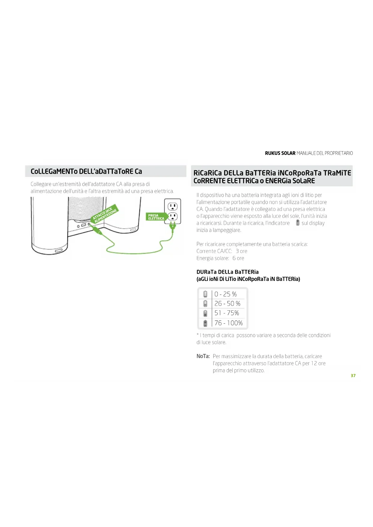 - I tempi di carica possono variare a seconda delle condizioni di luce solare. NoTa: Per massimizzare la durata della batteria, caricare l’apparecchio attraverso l’adattatore CA per 12 ore prima del primo utilizzo.Rukus solaR MANUALE DEL PROPRIETARIO