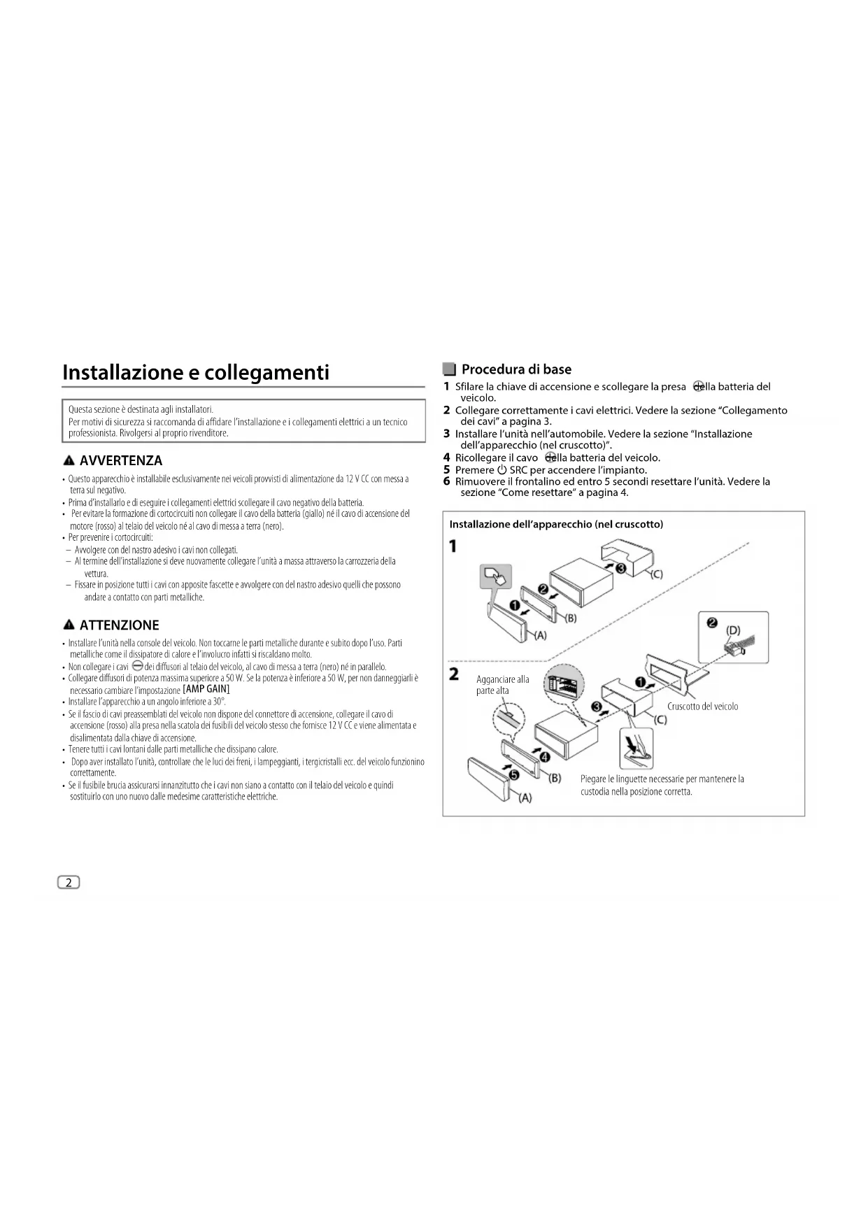 JS_JVC_QSG_KD_T812BT_E_FR.indd 9JS_JVC_QSG_KD_T812BT_E_FR.indd 9 24/7/2019 1:38:42 PM24/7/2019 1:38:42 PM2 Data Size: B6L (182 mm x 128 mm)Book Size: B6L (182 mm x 128 mm) Procedura di base 1 Sfilare la chiave di accensione e scollegare la presa della batteria del veicolo. 2 Collegare correttamente i cavi elettrici. Vedere la sezione “Collegamento dei cavi” a pagina3. 3 Installare l’unità nell’automobile. Vedere la sezione “Installazione dell’apparecchio (nel cruscotto)”. 4 Ricollegare il cavo della batteria del veicolo. 5 Premere B SRC per accendere l’impianto. 6 Rimuovere il frontalino ed entro 5 secondi resettare l’unità. Vedere la sezione “Come resettare” a pagina4. Installazione dell’apparecchio (nel cruscotto) Installazione e collegamenti Questa sezione è destinata agli installatori. Per motivi di sicurezza si raccomanda di affidare l’installazione e i collegamenti elettrici a un tecnico professionista. Rivolgersi al proprio rivenditore. AVVERTENZA