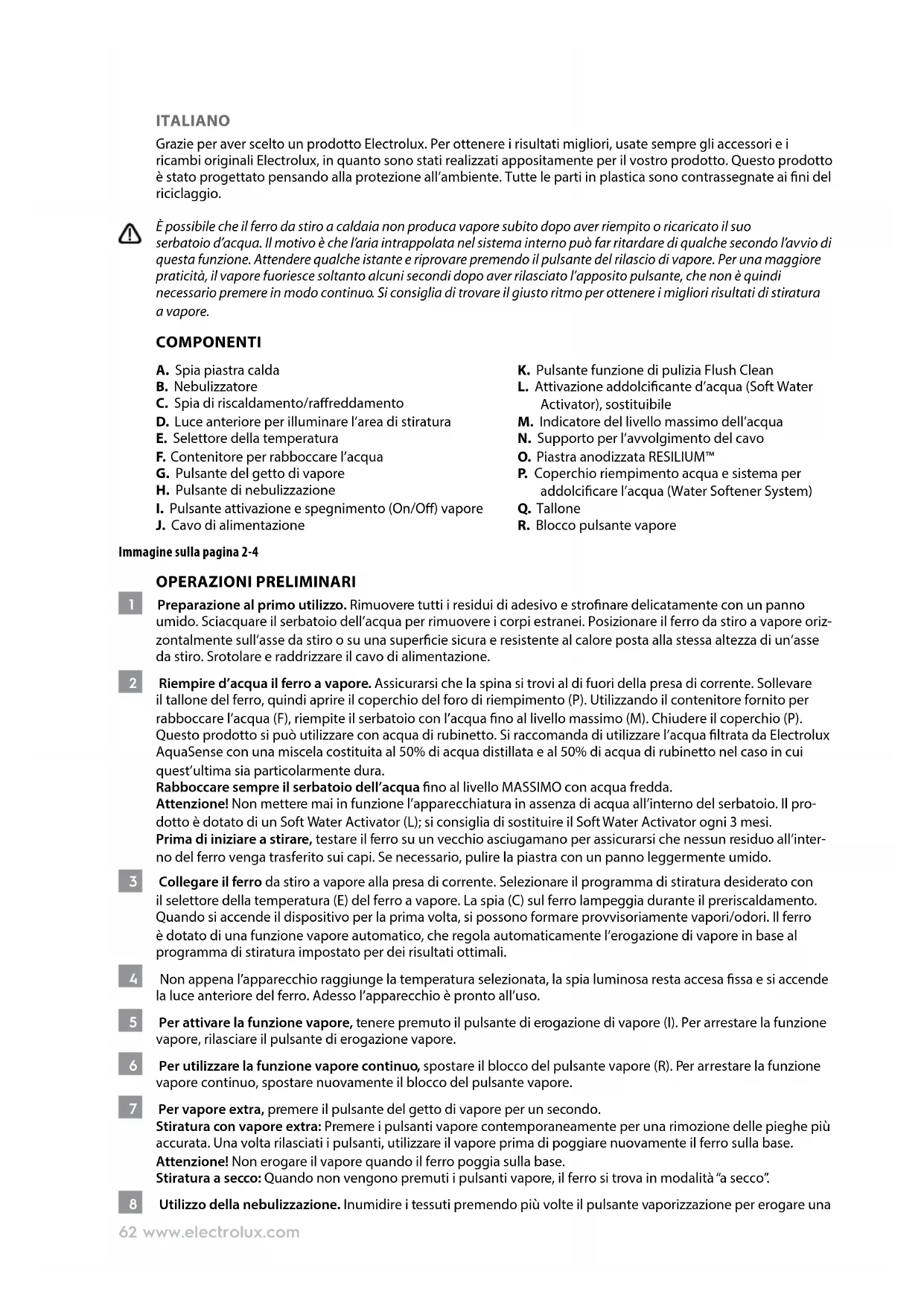 J. Cavo di alimentazione K. Pulsante funzione di pulizia Flush Clean L. Attivazione addolcicante d’acqua (Soft Water Activator), sostituibile M. Indicatore del livello massimo dell’acqua N. Supporto per l’avvolgimento del cavo O. Piastra anodizzata RESILIUM™ P. Coperchio riempimento acqua e sistema per addolcicare l’acqua (Water Softener System) Q. Tallone R. Blocco pulsante vapore Immagine sulla pagina 2-4 OPERAZIONI PRELIMINARI 1 Preparazione al primo utilizzo. Rimuovere tutti i residui di adesivo e stronare delicatamente con un panno umido. Sciacquare il serbatoio dell’acqua per rimuovere i corpi estranei. Posizionare il ferro da stiro a vapore oriz- zontalmente sull’asse da stiro o su una supercie sicura e resistente al calore posta alla stessa altezza di un’asse da stiro. Srotolare e raddrizzare il cavo di alimentazione. 2 Riempire d’acqua il ferro a vapore. Assicurarsi che la spina si trovi al di fuori della presa di corrente. Sollevare iltallonedel ferro, quindi aprire il coperchio del foro di riempimento (P). Utilizzando il contenitore fornito per rabboccare l’acqua (F),riempite il serbatoio con l’acquano al livello massimo (M). Chiudere il coperchio (P). Questo prodotto si può utilizzare con acqua di rubinetto. Si raccomanda di utilizzare l’acqua ltrata da Electrolux AquaSense con una miscela costituita al 50% di acqua distillata e al 50% di acqua di rubinetto nel caso in cui quest’ultima sia particolarmente dura. Rabboccare sempre il serbatoio dell’acqua no al livello MASSIMO con acqua fredda. Attenzione! Non mettere mai in funzione l’apparecchiatura in assenza di acqua all’interno del serbatoio. Il pro- dotto è dotato di un Soft Water Activator (L); si consiglia di sostituire il Soft Water Activator ogni 3 mesi. Prima di iniziare a stirare, testare il ferro su un vecchio asciugamano per assicurarsi che nessun residuo all’inter- no del ferro venga trasferito sui capi. Se necessario, pulire la piastra con un panno leggermente umido. 3 Collegare il ferro da stiro a vapore alla presa di corrente. Selezionare il programma di stiratura desiderato con il selettore della temperatura (E) del ferro a vapore. La spia (C) sul ferro lampeggia durante il preriscaldamento. Quando si accende il dispositivo per la prima volta, si possono formare provvisoriamente vapori/odori. Il ferro è dotato di una funzione vapore automatico, che regola automaticamente l’erogazione di vapore in base al programma di stiratura impostato per dei risultati ottimali. 4 Non appena l’apparecchio raggiunge la temperatura selezionata, la spia luminosa resta accesa ssa e si accende la luce anteriore del ferro. Adesso l’apparecchio è pronto all’uso. 5 Per attivare la funzione vapore, tenere premuto il pulsante di erogazione di vapore (I). Per arrestare la funzione vapore, rilasciare il pulsante di erogazione vapore. 6 Per utilizzare la funzione vapore continuo, spostare il blocco del pulsante vapore (R). Per arrestare la funzione vapore continuo, spostare nuovamente il blocco del pulsante vapore. 7 Per vapore extra, premere il pulsante del getto di vapore per un secondo. Stiratura con vapore extra: Premere i pulsanti vapore contemporaneamente per una rimozione delle pieghe più accurata. Una volta rilasciati i pulsanti, utilizzare il vapore prima di poggiare nuovamente il ferro sulla base. Attenzione! Non erogare il vapore quando il ferro poggia sulla base. Stiratura a secco: Quando non vengono premuti i pulsanti vapore, il ferro si trova in modalità “a secco”. 8 Utilizzo della nebulizzazione. Inumidire i tessuti premendo più volte il pulsante vaporizzazione per erogare una63www.electrolux.com