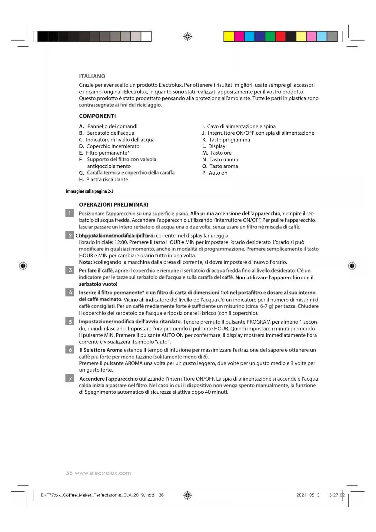 - Tisztítás vagy karbantartás előtt, illetve használat után mindig kapcsolja ki a készüléket és húzza ki a tápkábelt a hálózati aljzatból. 2021-05-21 15:27:0236 www.electrolux.com ITALIANO Grazie per aver scelto un prodotto Electrolux. Per ottenere i risultati migliori, usate sempre gli accessori e i ricambi originali Electrolux, in quanto sono stati realizzati appositamente per il vostro prodotto. Questo prodotto è stato progettato pensando alla protezione all’ambiente. Tutte le parti in plastica sono COMPONENTI A. Pannello dei comandi B. Serbatoio dell’acqua C. Indicatore di livello dell’acqua D. Coperchio incernierato E. Filtro permanente*