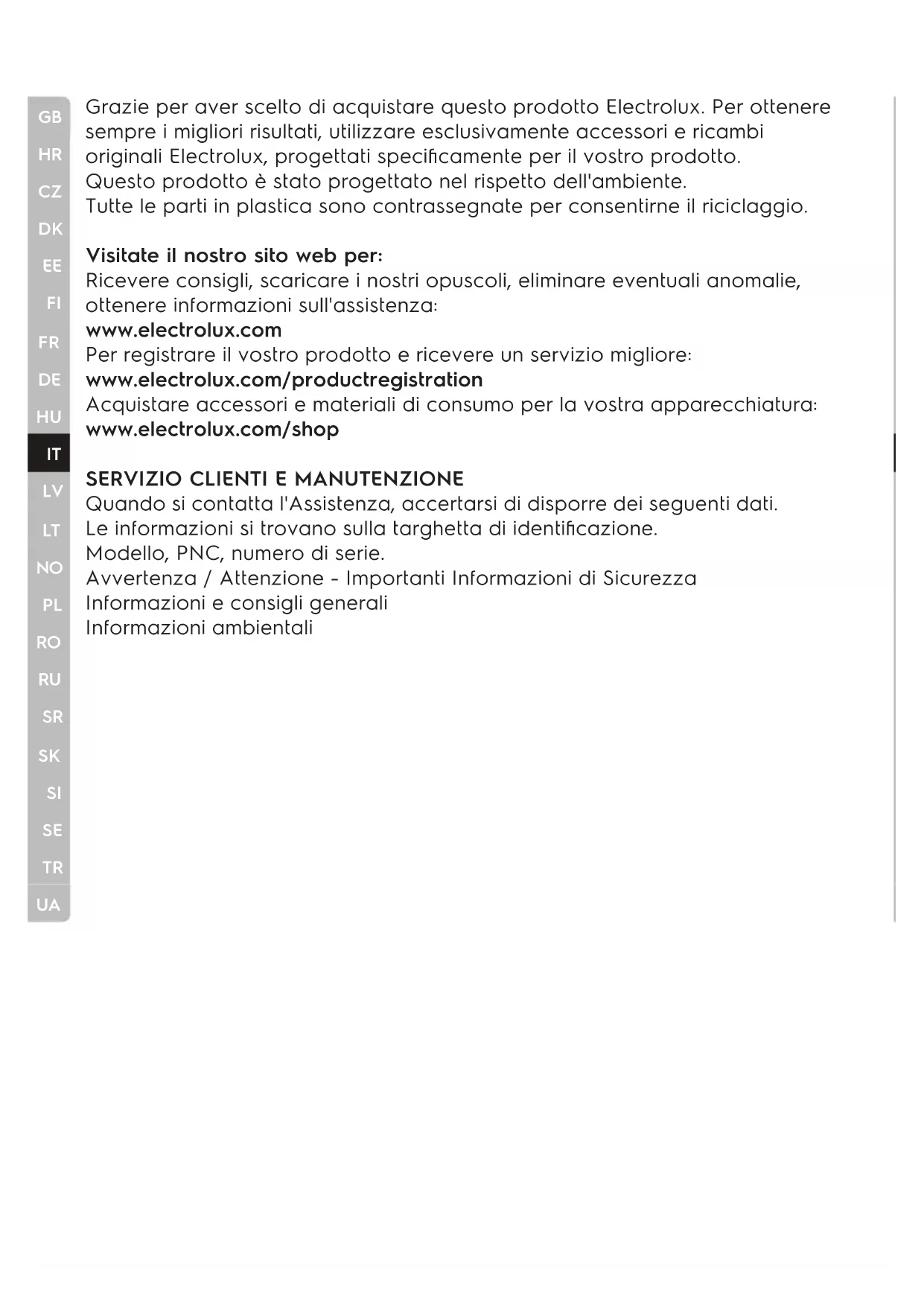 Grazie per aver scelto di acquistare questo prodotto Electrolux. Per ottenere sempre i migliori risultati, utilizzare esclusivamente accessori e ricambi originali Electrolux, progettati specificamente per il vostro prodotto. Questo prodotto è stato progettato nel rispetto dell'ambiente. Tutte le parti in plastica sono contrassegnate per consentirne il riciclaggio. Visitate il nostro sito web per: Ricevere consigli, scaricare i nostri opuscoli, eliminare eventuali anomalie, ottenere informazioni sull'assistenza: www.electrolux.com Per registrare il vostro prodotto e ricevere un servizio migliore: www.electrolux.com/productregistration Acquistare accessori e materiali di consumo per la vostra apparecchiatura: www.electrolux.com/shop