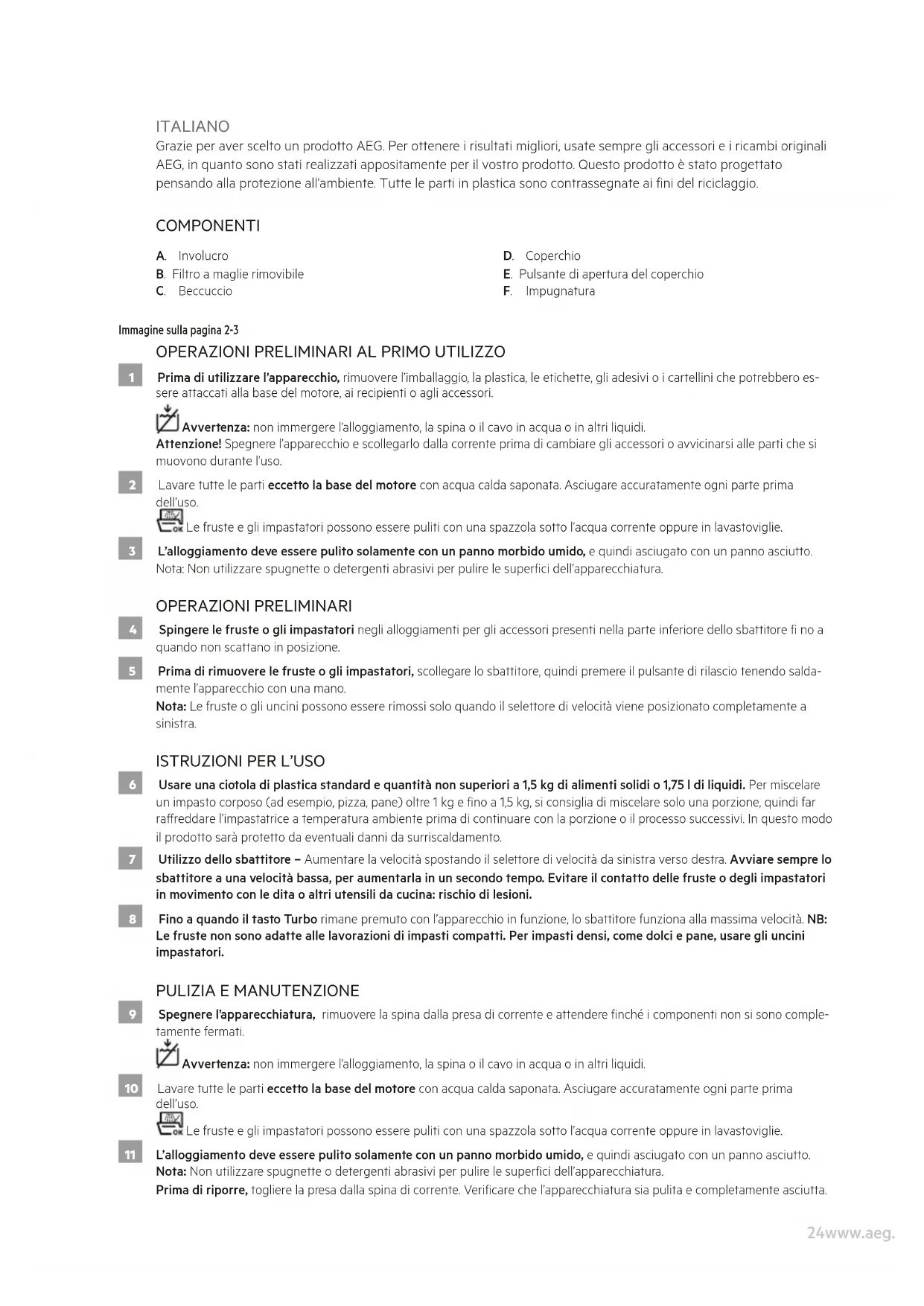 9 Spegnere l’apparecchiatura, rimuovere la spina dalla presa di corrente e attendere nché i componenti non si sono comple- tamente fermati. Avvertenza: non immergere l’alloggiamento, la spina o il cavo in acqua o in altri liquidi. 10 Lavare tutte le parti eccetto la base del motore con acqua calda saponata. Asciugare accuratamente ogni parte prima dell’uso. Le fruste e gli impastatori possono essere puliti con una spazzola sotto l’acqua corrente oppure in lavastoviglie. 11 L’alloggiamento deve essere pulito solamente con un panno morbido umido, e quindi asciugato con un panno asciutto. Nota: Non utilizzare spugnette o detergenti abrasivi per pulire le superci dell’apparecchiatura. Prima di riporre, togliere la presa dalla spina di corrente. Vericare che l’apparecchiatura sia pulita e completamente asciutta.25www.aeg.com