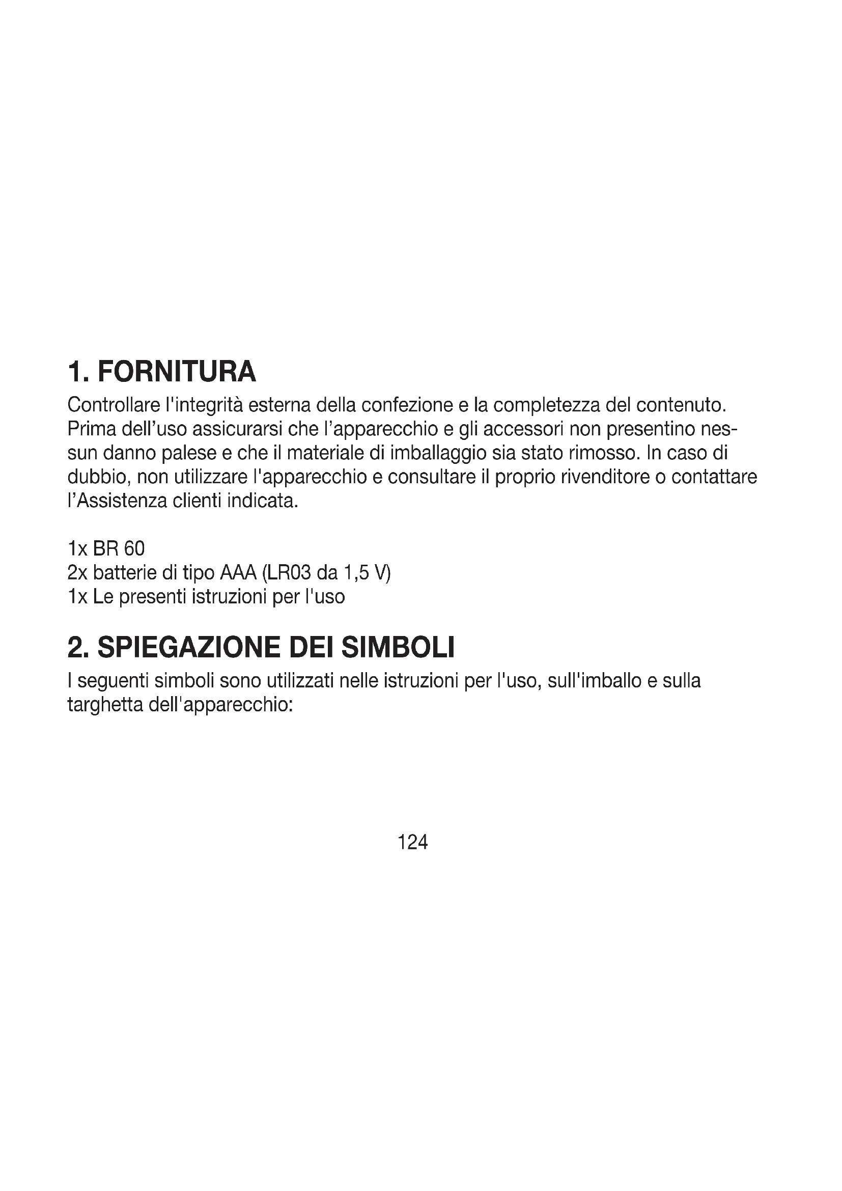 Controllare l'integrità esterna della confezione e la completezza del contenuto. Prima dell’uso assicurarsi che l’apparecchio e gli accessori non presentino nes- sun danno palese e che il materiale di imballaggio sia stato rimosso. In caso di dubbio, non utilizzare l'apparecchio e consultare il proprio rivenditore o contattare l’Assistenza clienti indicata. 1x BR 60 2x batterie di tipo AAA (LR03 da 1,5 V) 1x Le presenti istruzioni per l'uso