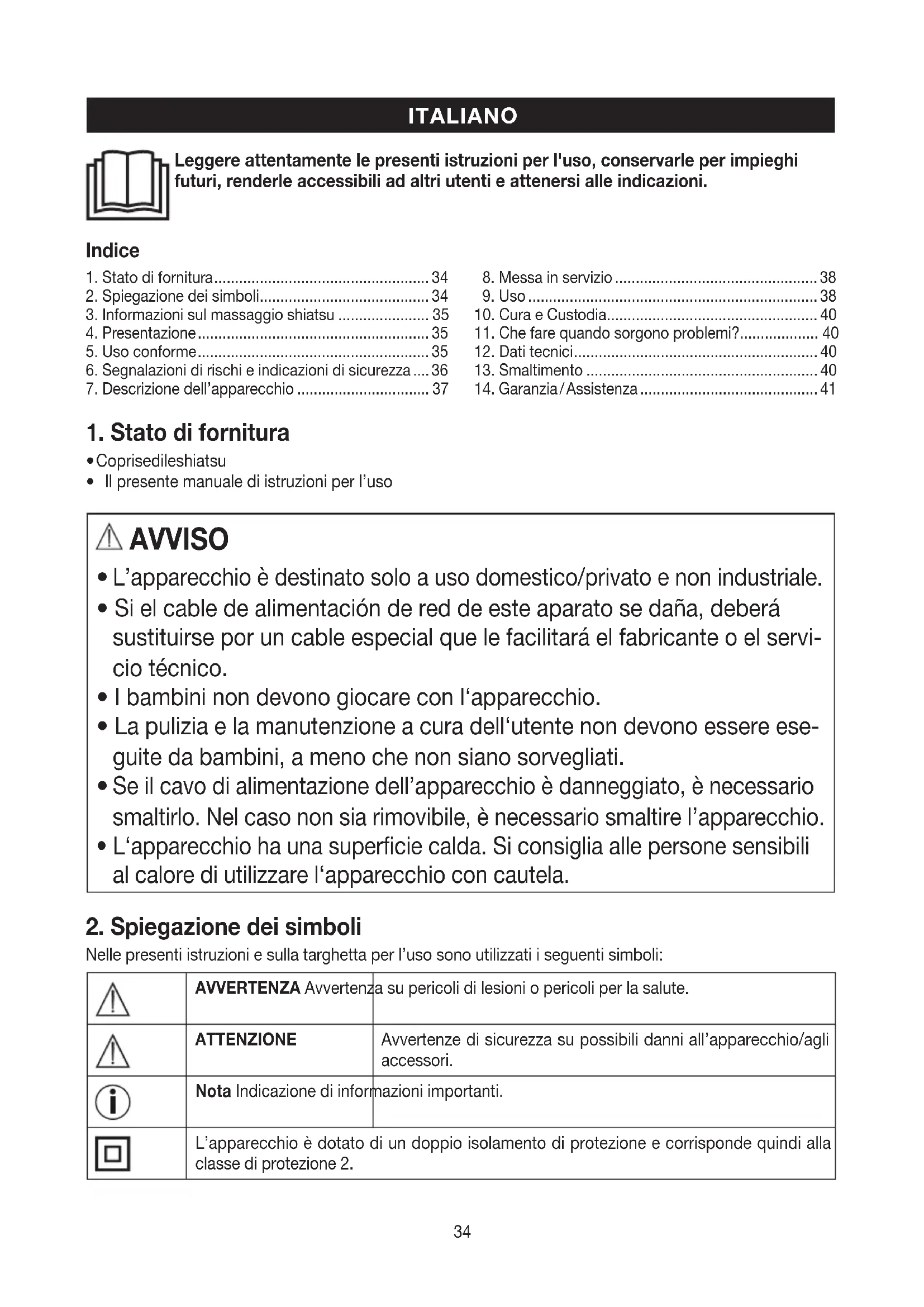 Nelle presenti istruzioni e sulla targhetta per l’uso sono utilizzati i seguenti simboli:AVVERTENZA Avvertenza su pericoli di lesioni o pericoli per la salute.ATTENZIONEAvvertenze di sicurezza su possibili danni all’apparecchio/agli accessori.Nota Indicazione di informazioni importanti.L’apparecchio è dotato di un doppio isolamento di protezione e corrisponde quindi alla classe di protezione 2. Indice