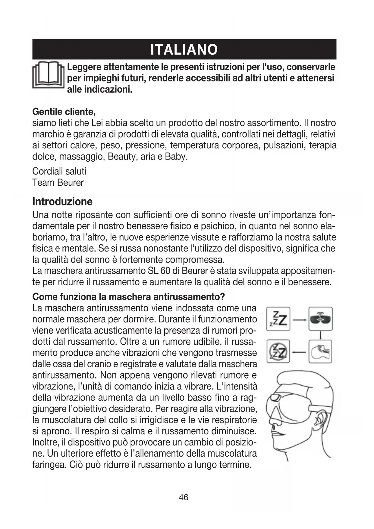 sabilidad legal preceptiva. Las reparaciones o la sustitución del producto no prolongarán en ningún caso el periodo de garantía.46 ITALIANO Gentile cliente, siamo lieti che Lei abbia scelto un prodotto del nostro assortimento. Il nostro marchio è garanzia di prodotti di elevata qualità, controllati nei dettagli, relativi ai settori calore, peso, pressione, temperatura corporea, pulsazioni, terapia dolce, massaggio, Beauty, aria e Baby. Cordiali saluti Team Beurer Introduzione Una notte riposante con sucienti ore di sonno riveste un’importanza fon- damentale per il nostro benessere fisico e psichico, in quanto nel sonno ela- boriamo, tra l’altro, le nuove esperienze vissute e raorziamo la nostra salute fisica e mentale. Se si russa nonostante l’utilizzo del dispositivo, significa che la qualità del sonno è fortemente compromessa. La maschera antirussamento SL 60 di Beurer è stata sviluppata appositamen- te per ridurre il russamento e aumentare la qualità del sonno e il benessere. Come funziona la maschera antirussamento? La maschera antirussamento viene indossata come una normale maschera per dormire. Durante il funzionamento viene verificata acusticamente la presenza di rumori pro- dotti dal russamento. Oltre a un rumore udibile, il russa- mento produce anche vibrazioni che vengono trasmesse dalle ossa del cranio e registrate e valutate dalla maschera antirussamento. Non appena vengono rilevati rumore e vibrazione, l’unità di comando inizia a vibrare. L’intensità della vibrazione aumenta da un livello basso fino a rag- giungere l’obiettivo desiderato. Per reagire alla vibrazione, la muscolatura del collo si irrigidisce e le vie respiratorie si aprono. Il respiro si calma e il russamento diminuisce. Inoltre, il dispositivo può provocare un cambio di posizio- ne. Un ulteriore eetto è l’allenamento della muscolatura faringea. Ciò può ridurre il russamento a lungo termine. Leggere attentamente le presenti istruzioni per l'uso, conservarle per impieghi futuri, renderle accessibili ad altri utenti e attenersi alle indicazioni.47 L’app “beurer SleepQuiet” ore le seguenti funzioni: