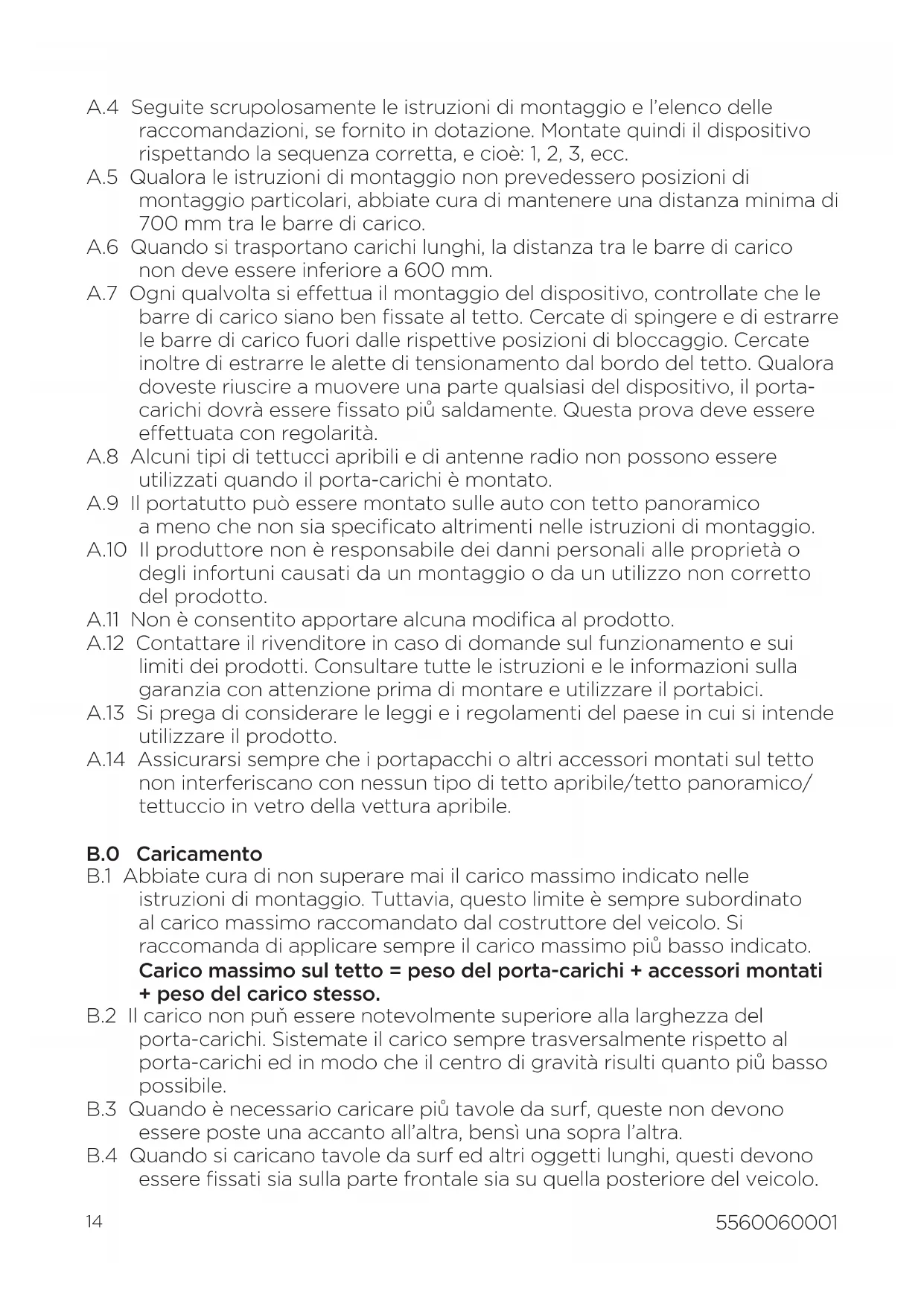 A.4 Seguite scrupolosamente le istruzioni di montaggio e l’elenco delle raccomandazioni, se fornito in dotazione. Montate quindi il dispositivo rispettando la sequenza corretta, e cioè: 1, 2, 3, ecc. A.5 Qualora le istruzioni di montaggio non prevedessero posizioni di montaggio particolari, abbiate cura di mantenere una distanza minima di 700 mm tra le barre di carico. A.6 Quando si trasportano carichi lunghi, la distanza tra le barre di carico non deve essere inferiore a 600 mm. A.7 Ogni qualvolta si eettua il montaggio del dispositivo, controllate che le barre di carico siano ben fissate al tetto. Cercate di spingere e di estrarre le barre di carico fuori dalle rispettive posizioni di bloccaggio. Cercate inoltre di estrarre le alette di tensionamento dal bordo del tetto. Qualora doveste riuscire a muovere una parte qualsiasi del dispositivo, il porta- carichi dovrà essere fissato piů saldamente. Questa prova deve essere eettuata con regolarità. A.8 Alcuni tipi di tettucci apribili e di antenne radio non possono essere utilizzati quando il porta-carichi è montato. A.9 Il portatutto può essere montato sulle auto con tetto panoramico ameno che non sia specificato altrimenti nelle istruzioni di montaggio. A.10 Il produttore non è responsabile dei danni personali alle proprietà o degli infortuni causati da un montaggio o da un utilizzo non corretto del prodotto. A.11 Non è consentito apportare alcuna modifica al prodotto. A.12 Contattare il rivenditore in caso di domande sul funzionamento e sui limiti dei prodotti. Consultare tutte le istruzioni e le informazioni sulla garanzia con attenzione prima di montare e utilizzare il portabici. A.13 Si prega di considerare le leggi e i regolamenti del paese in cui si intende utilizzare il prodotto. A.14 Assicurarsi sempre che i portapacchi o altri accessori montati sul tetto non interferiscano con nessun tipo di tetto apribile/tetto panoramico/ tettuccio in vetro della vettura apribile. B.0 Caricamento B.1 Abbiate cura di non superare mai il carico massimo indicato nelle istruzioni di montaggio. Tuttavia, questo limite è sempre subordinato al carico massimo raccomandato dal costruttore del veicolo. Si raccomanda di applicare sempre il carico massimo piů basso indicato. Carico massimo sul tetto = peso del porta-carichi + accessori montati + peso del carico stesso. B.2 Il carico non puň essere notevolmente superiore alla larghezza del porta-carichi. Sistemate il carico sempre trasversalmente rispetto al porta-carichi ed in modo che il centro di gravità risulti quanto piů basso possibile. B.3 Quando è necessario caricare piů tavole da surf, queste non devono essere poste una accanto all’altra, bensì una sopra l’altra. B.4 Quando si caricano tavole da surf ed altri oggetti lunghi, questi devono essere fissati sia sulla parte frontale sia su quella posteriore del veicolo.15