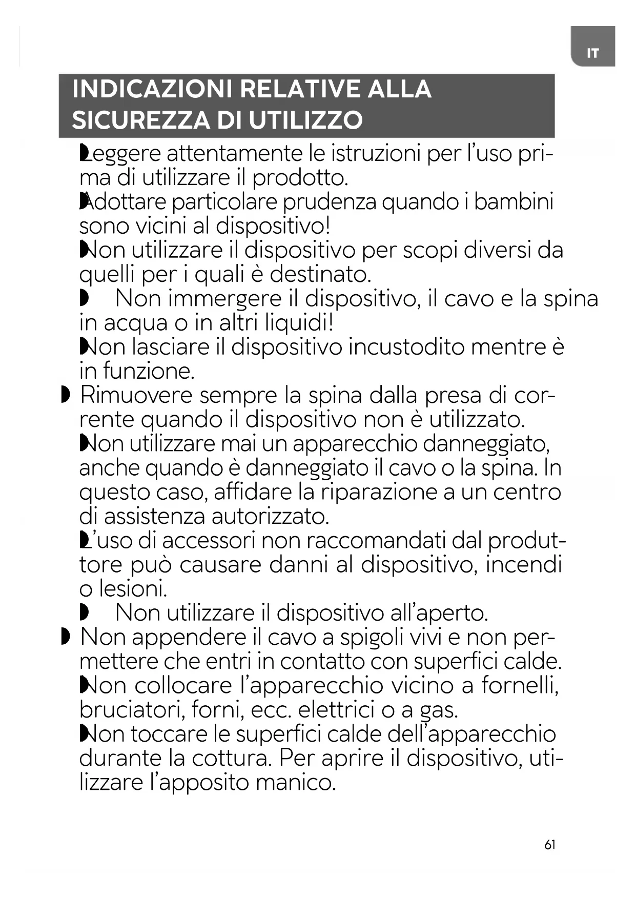 Non utilizzare il dispositivo per scopi diversi da quelli per i quali è destinato. Non immergere il dispositivo, il cavo e la spina in acqua o in altri liquidi!