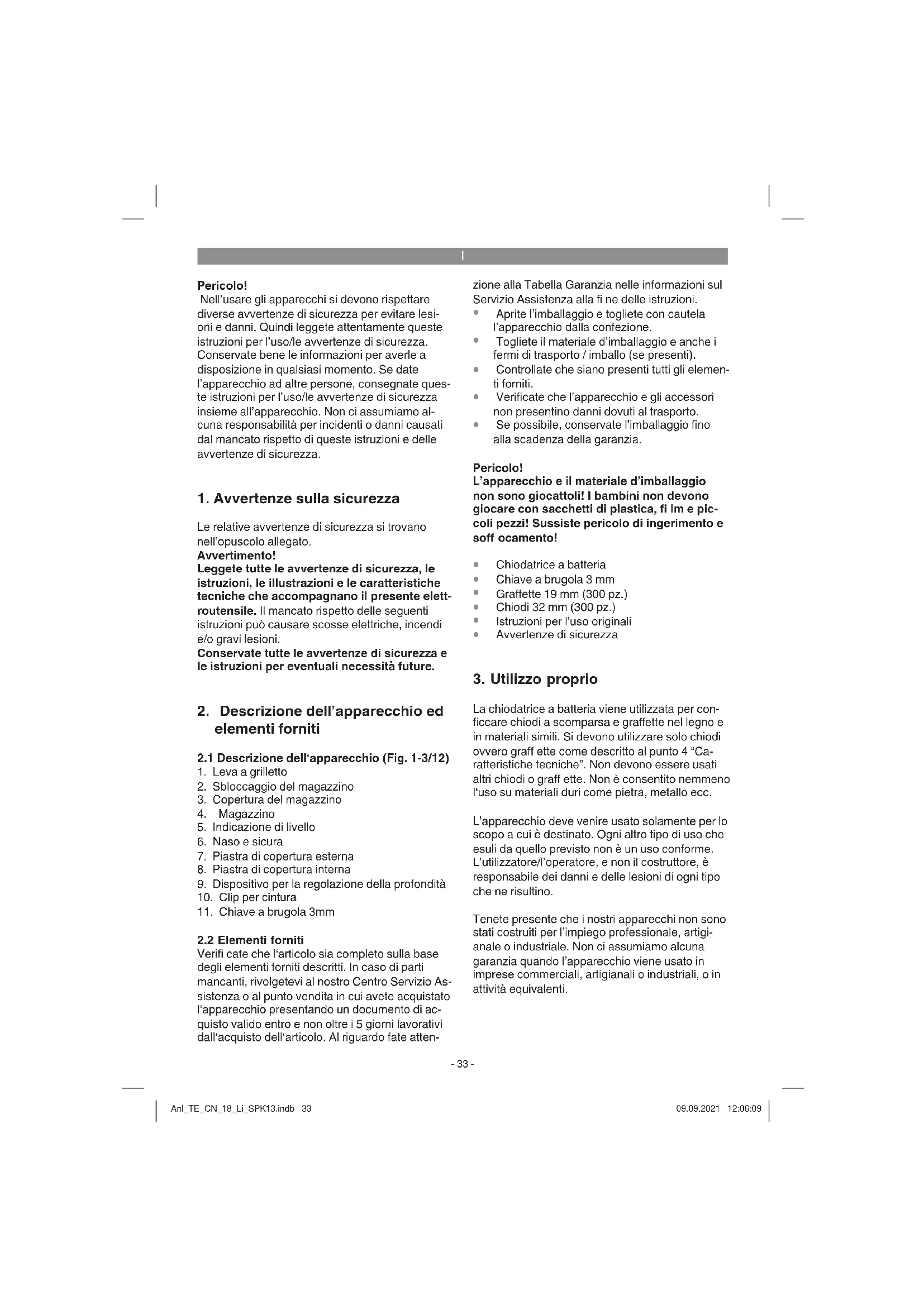 La chiodatrice a batteria viene utilizzata per con- fi ccare chiodi a scomparsa e graff ette nel legno e in materiali simili. Si devono utilizzare solo chiodi ovvero graff ette come descritto al punto 4 “Ca- ratteristiche tecniche”. Non devono essere usati altri chiodi o graff ette. Non è consentito nemmeno l‘uso su materiali duri come pietra, metallo ecc. L’apparecchio deve venire usato solamente per lo scopo a cui è destinato. Ogni altro tipo di uso che esuli da quello previsto non è un uso conforme. L’utilizzatore/l’operatore, e non il costruttore, è responsabile dei danni e delle lesioni di ogni tipo che ne risultino. Tenete presente che i nostri apparecchi non sono stati costruiti per l’impiego professionale, artigi- anale o industriale. Non ci assumiamo alcuna garanzia quando l’apparecchio viene usato in imprese commerciali, artigianali o industriali, o in attività equivalenti. Anl_TE_CN_18_Li_SPK13.indb 33Anl_TE_CN_18_Li_SPK13.indb 33 09.09.2021 12:06:0909.09.2021 12:06:09I