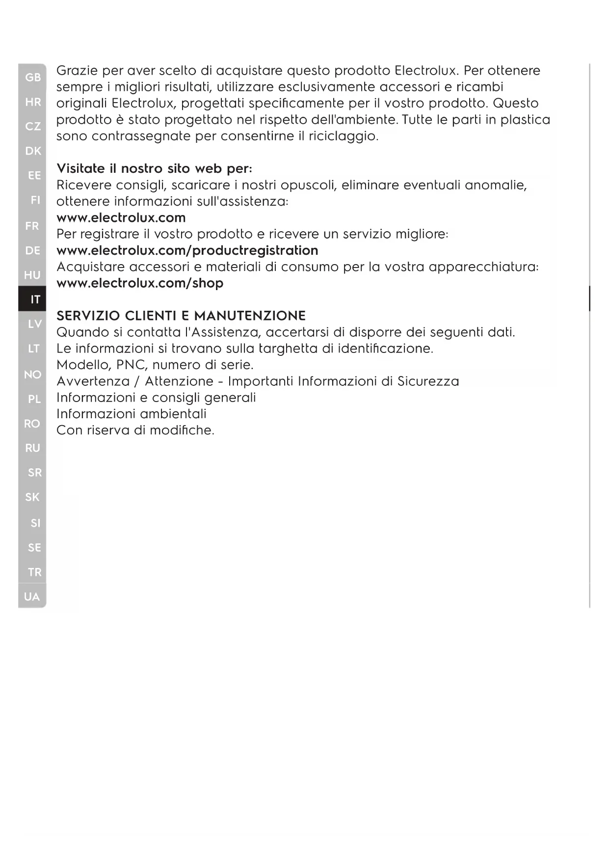 Grazie per aver scelto di acquistare questo prodotto Electrolux. Per ottenere sempre i migliori risultati, utilizzare esclusivamente accessori e ricambi originali Electrolux, progettati specificamente per il vostro prodotto. Questo prodotto è stato progettato nel rispetto dell'ambiente. Tutte le parti in plastica sono contrassegnate per consentirne il riciclaggio. Visitate il nostro sito web per: Ricevere consigli, scaricare i nostri opuscoli, eliminare eventuali anomalie, ottenere informazioni sull'assistenza: www.electrolux.com Per registrare il vostro prodotto e ricevere un servizio migliore: www.electrolux.com/productregistration Acquistare accessori e materiali di consumo per la vostra apparecchiatura: www.electrolux.com/shop