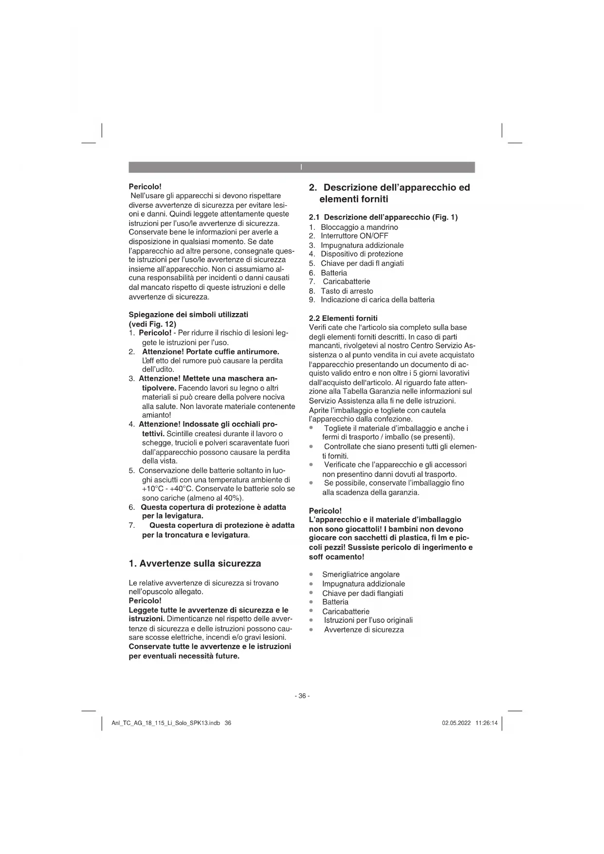 Avvertimento! Togliete sempre la batteria prima di eseguire re- golazioni sull‘apparecchio. Prima di mettere in esercizio il vostro apparecchio a batteria leggete assolutamente le seguenti av- vertenze: