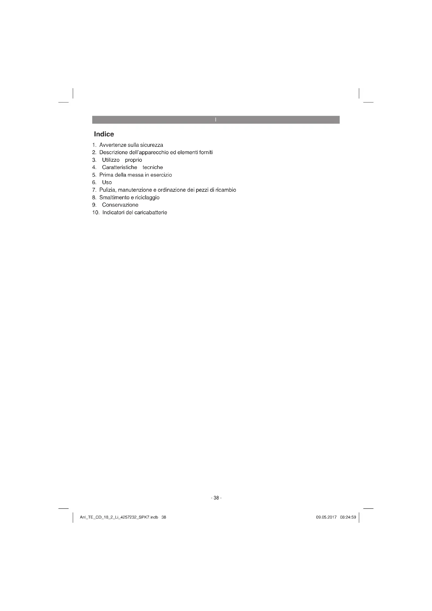 no-braccio se l’apparecchio viene utilizzato a lungo, non viene tenuto in modo corretto o se la manutenzione non è appropriata. Limitate il tempo di lavoro. Al riguardo si devono prendere in considerazione tutte le fasi del ciclo di esercizio (ad esempio i periodi in cui l’elettroutensile è disinserito e quelli in cui è inserito, ma funziona a vuoto). Anl_TE_CD_18_2_Li_4257232_SPK7.indb 41Anl_TE_CD_18_2_Li_4257232_SPK7.indb 41 09.05.2017 08:25:0009.05.2017 08:25:00I