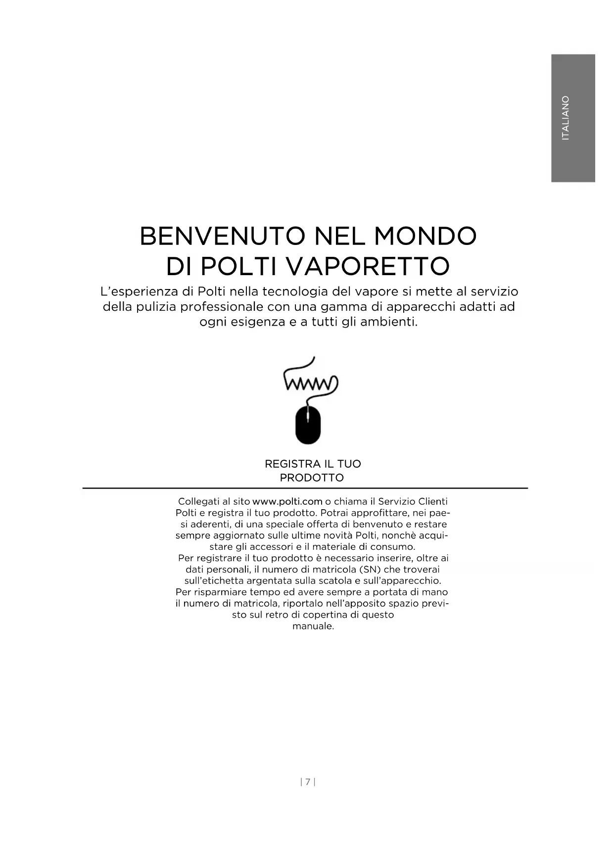 PRODOTTO Collegati al sito www.polti.com o chiama il Servizio Clienti Polti e registra il tuo prodotto. Potrai approfittare, nei pae- si aderenti, di una speciale offerta di benvenuto e restare sempre aggiornato sulle ultime novità Polti, nonchè acqui- stare gli accessori e il materiale di consumo. Per registrare il tuo prodotto è necessario inserire, oltre ai dati personali, il numero di matricola (SN) che troverai sull’etichetta argentata sulla scatola e sull’apparecchio. Per risparmiare tempo ed avere sempre a portata di mano il numero di matricola, riportalo nell’apposito spazio previ- sto sul retro di copertina di questo manuale.ITALIANO | 8 | LEGENDA