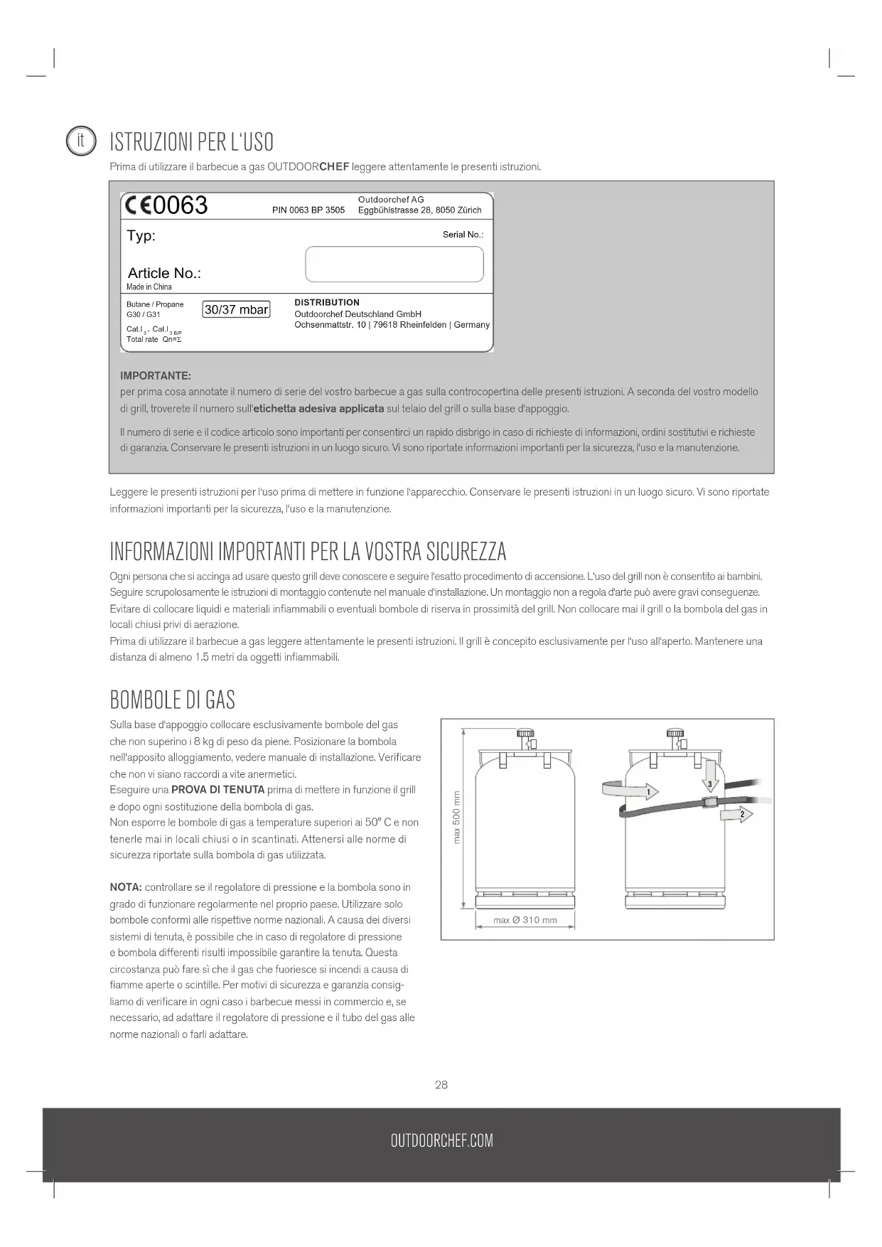 Prima di utilizzare il barbecue a gas OUTDOORCHEF leggere attentamente le presenti istruzioni. Leggere le presenti istruzioni per l‘uso prima di mettere in funzione l‘apparecchio. Conservare le presenti istruzioni in un luogo sicuro. Vi sono riportate informazioni importanti per la sicurezza, l‘uso e la manutenzione.
