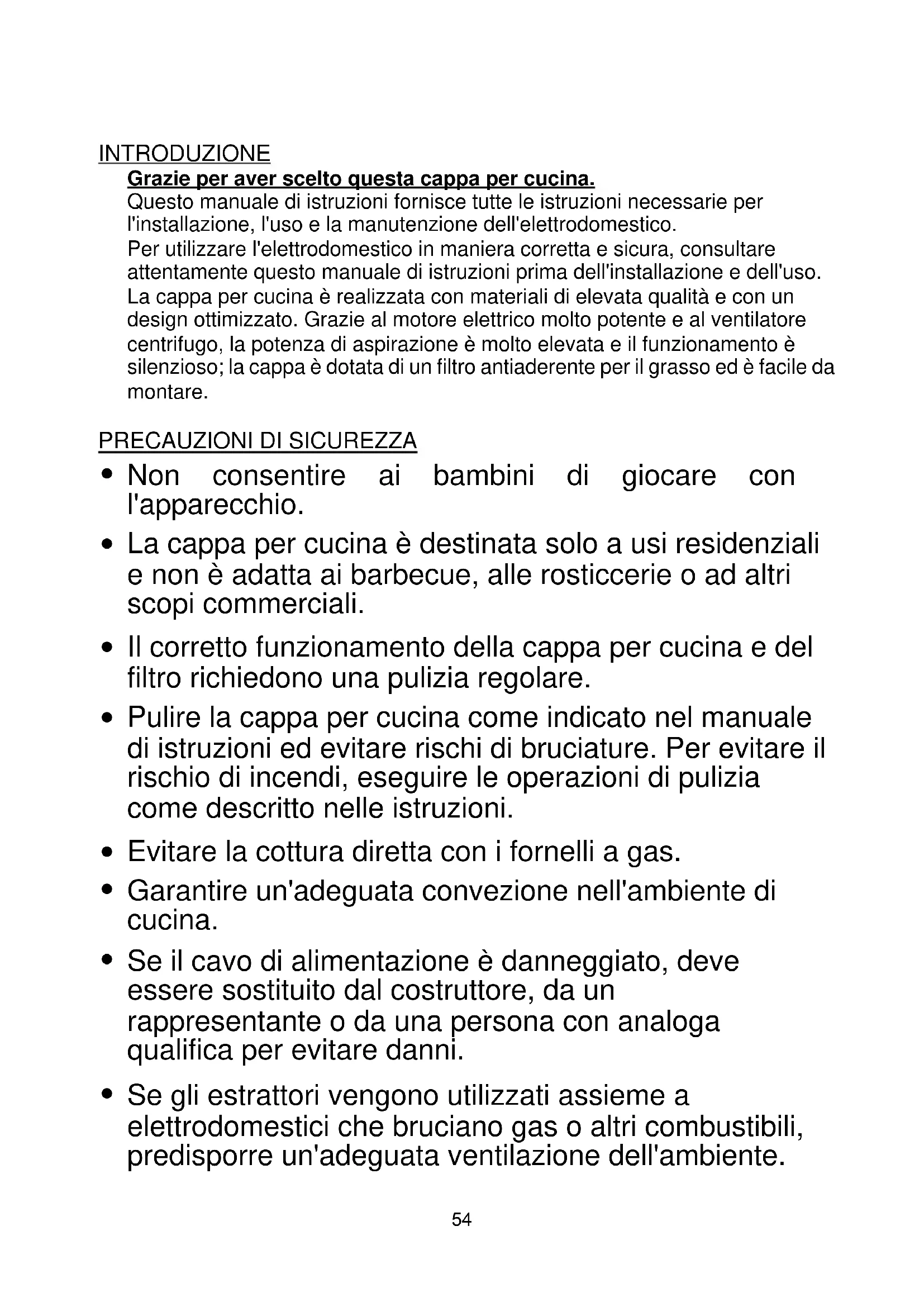 53INTRODUZIONE Grazie per aver scelto questa cappa per cucina. Questo manuale di istruzioni fornisce tutte le istruzioni necessarie per l'installazione, l'uso e la manutenzione dell'elettrodomestico. Per utilizzare l'elettrodomestico in maniera corretta e sicura, consultare attentamente questo manuale di istruzioni prima dell'installazione e dell'uso. La cappa per cucina è realizzata con materiali di elevata qualità e con un design ottimizzato. Grazie al motore elettrico molto potente e al ventilatore centrifugo, la potenza di aspirazione è molto elevata e il funzionamento è silenzioso; la cappa è dotata di un filtro antiaderente per il grasso ed è facile da montare.