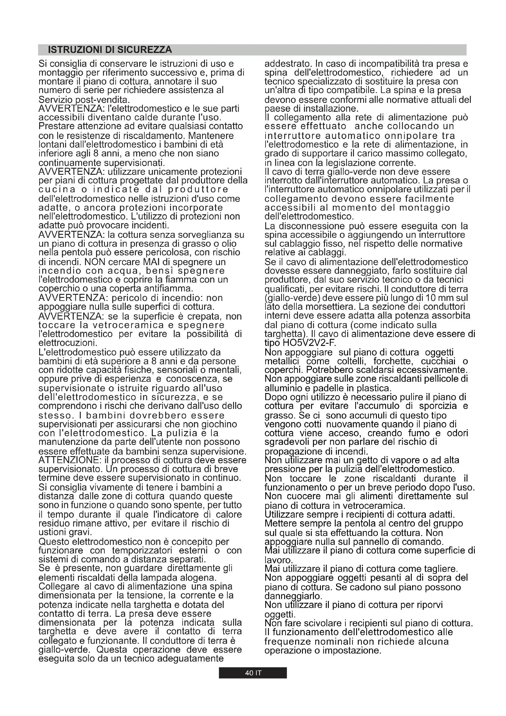 7,2 kW 686 l/h 524 g/h40 IT Si consiglia di conservare le istruzioni di uso e montaggio per riferimento successivo e, prima di montare il piano di cottura, annotare il suo numero di serie per richiedere assistenza al Servizio post-vendita. AVVERTENZA: l'elettrodomestico e le sue parti accessibili diventano calde durante l'uso. Prestare attenzione ad evitare qualsiasi contatto con le resistenze di riscaldamento. Mantenere lontani dall'elettrodomestico i bambini di età inferiore agli 8 anni, a meno che non siano continuamente supervisionati. AVVERTENZA: utilizzare unicamente protezioni per piani di cottura progettate dal produttore della cucina o indicate dal produttore dell'elettrodomestico nelle istruzioni d'uso come adatte, o ancora protezioni incorporate nell'elettrodomestico. L'utilizzo di protezioni non adatte può provocare incidenti. AVVERTENZA: la cottura senza sorveglianza su un piano di cottura in presenza di grasso o olio nella pentola può essere pericolosa, con rischio di incendi. NON cercare MAI di spegnere un incendio con acqua, bensì spegnere l'elettrodomestico e coprire la fiamma con un coperchio o una coperta antifiamma. AVVERTENZA: pericolo di incendio: non appoggiare nulla sulle superfici di cottura. AVVERTENZA: se la superficie è crepata, non toccare la vetroceramica e spegnere l'elettrodomestico per evitare la possibilità di elettrocuzioni. L'elettrodomestico può essere utilizzato da bambini di età superiore a 8 anni e da persone con ridotte capacità fisiche, sensoriali o mentali, oppure prive di esperienza e conoscenza, se supervisionate o istruite riguardo all'uso dell'elettrodomestico in sicurezza, e se comprendono i rischi che derivano dall'uso dello stesso. I bambini dovrebbero essere supervisionati per assicurarsi che non giochino con l'elettrodomestico. La pulizia e la manutenzione da parte dell'utente non possono essere effettuate da bambini senza supervisione. ATTENZIONE: il processo di cottura deve essere supervisionato. Un processo di cottura di breve termine deve essere supervisionato in continuo. Si consiglia vivamente di tenere i bambini a distanza dalle zone di cottura quando queste sono in funzione o quando sono spente, per tutto il tempo durante il quale l'indicatore di calore residuo rimane attivo, per evitare il rischio di ustioni gravi. Questo elettrodomestico non è concepito per funzionare con temporizzatori esterni o con sistemi di comando a distanza separati. Se è presente, non guardare direttamente gli elementi riscaldati della lampada alogena. Collegare al cavo di alimentazione una spina dimensionata per la tensione, la corrente e la potenza indicate nella targhetta e dotata del contatto di terra. La presa deve essere dimensionata per la potenza indicata sulla targhetta e deve avere il contatto di terra collegato e funzionante. Il conduttore di terra è giallo-verde. Questa operazione deve essere eseguita solo da un tecnico adeguatamente