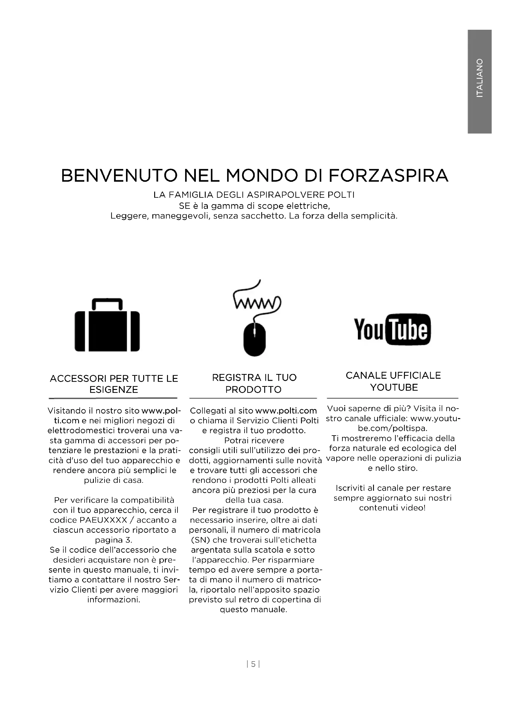 ESIGENZE Visitando il nostro sito www.pol- ti.com e nei migliori negozi di elettrodomestici troverai una va- sta gamma di accessori per po- tenziare le prestazioni e la prati- cità d'uso del tuo apparecchio e rendere ancora più semplici le pulizie di casa. Per verificare la compatibilità con il tuo apparecchio, cerca il codice PAEUXXXX / accanto a ciascun accessorio riportato a pagina 3. Se il codice dell’accessorio che desideri acquistare non è pre- sente in questo manuale, ti invi- tiamo a contattare il nostro Ser- vizio Clienti per avere maggiori informazioni. CANALE UFFICIALE YOUTUBE Vuoi saperne di più? Visita il no- stro canale ufficiale: www.youtu- be.com/poltispa. Ti mostreremo l’efficacia della forza naturale ed ecologica del vapore nelle operazioni di pulizia e nello stiro. Iscriviti al canale per restare sempre aggiornato sui nostri contenuti video!