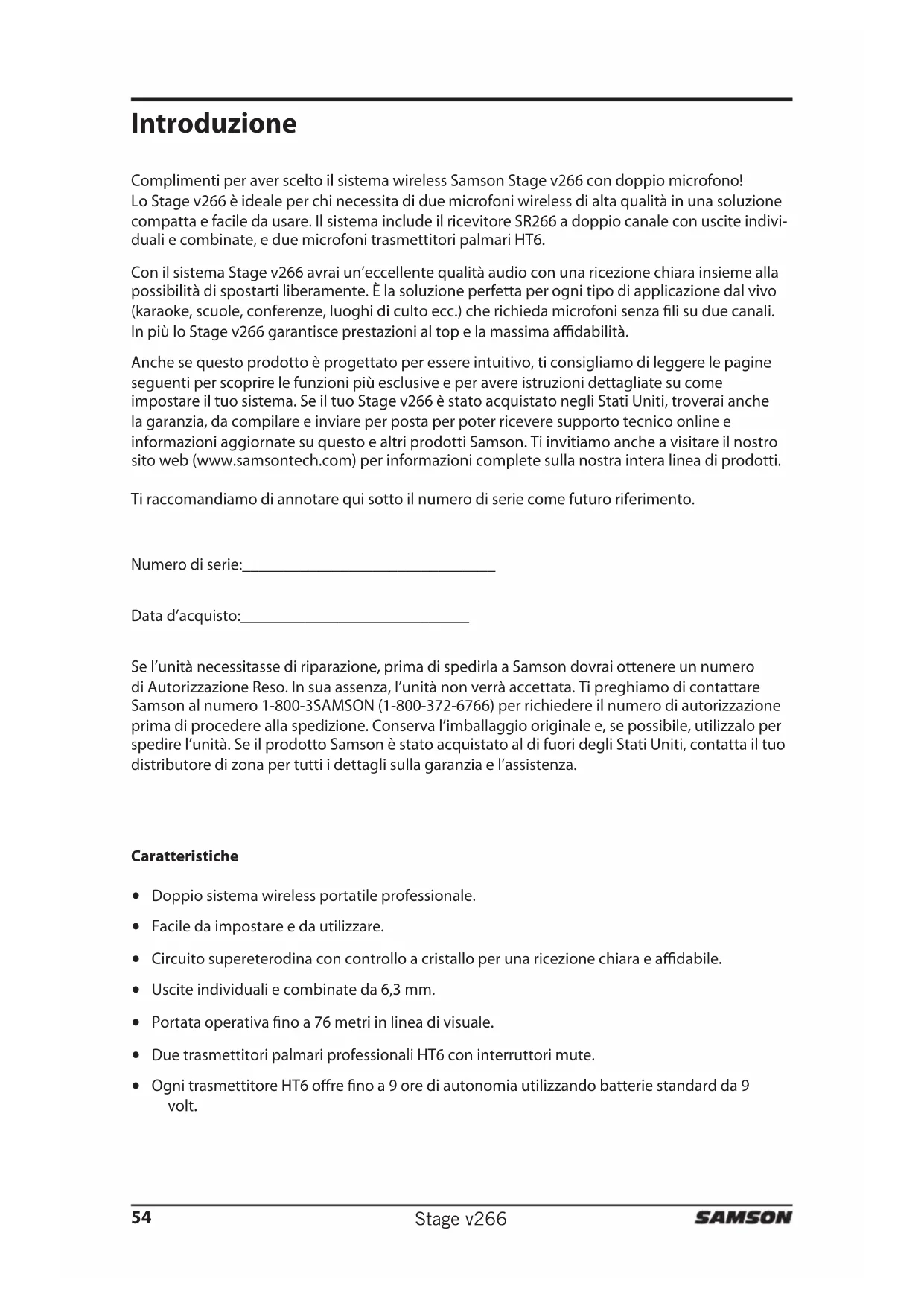 - Risoluzione dei problemi Stage v266 Complimenti per aver scelto il sistema wireless Samson Stage v266 con doppio microfono! Lo Stage v266 è ideale per chi necessita di due microfoni wireless di alta qualità in una soluzione compatta e facile da usare. Il sistema include il ricevitore SR266 a doppio canale con uscite indivi- duali e combinate, e due microfoni trasmettitori palmari HT6. Con il sistema Stage v266 avrai un’eccellente qualità audio con una ricezione chiara insieme alla possibilità di spostarti liberamente. È la soluzione perfetta per ogni tipo di applicazione dal vivo (karaoke, scuole, conferenze, luoghi di culto ecc.) che richieda microfoni senza li su due canali. In più lo Stage v266 garantisce prestazioni al top e la massima adabilità. Anche se questo prodotto è progettato per essere intuitivo, ti consigliamo di leggere le pagine seguenti per scoprire le funzioni più esclusive e per avere istruzioni dettagliate su come impostare il tuo sistema. Se il tuo Stage v266 è stato acquistato negli Stati Uniti, troverai anche la garanzia, da compilare e inviare per posta per poter ricevere supporto tecnico online e informazioni aggiornate su questo e altri prodotti Samson. Ti invitiamo anche a visitare il nostro sito web (www.samsontech.com) per informazioni complete sulla nostra intera linea di prodotti. Ti raccomandiamo di annotare qui sotto il numero di serie come futuro riferimento. Numero di serie:_______________________________ Data d’acquisto:____________________________ Se l’unità necessitasse di riparazione, prima di spedirla a Samson dovrai ottenere un numero di Autorizzazione Reso. In sua assenza, l’unità non verrà accettata. Ti preghiamo di contattare Samson al numero 1-800-3SAMSON (1-800-372-6766) per richiedere il numero di autorizzazione prima di procedere alla spedizione. Conserva l’imballaggio originale e, se possibile, utilizzalo per spedire l’unità. Se il prodotto Samson è stato acquistato al di fuori degli Stati Uniti, contatta il tuo distributore di zona per tutti i dettagli sulla garanzia e l’assistenza. p. 6154