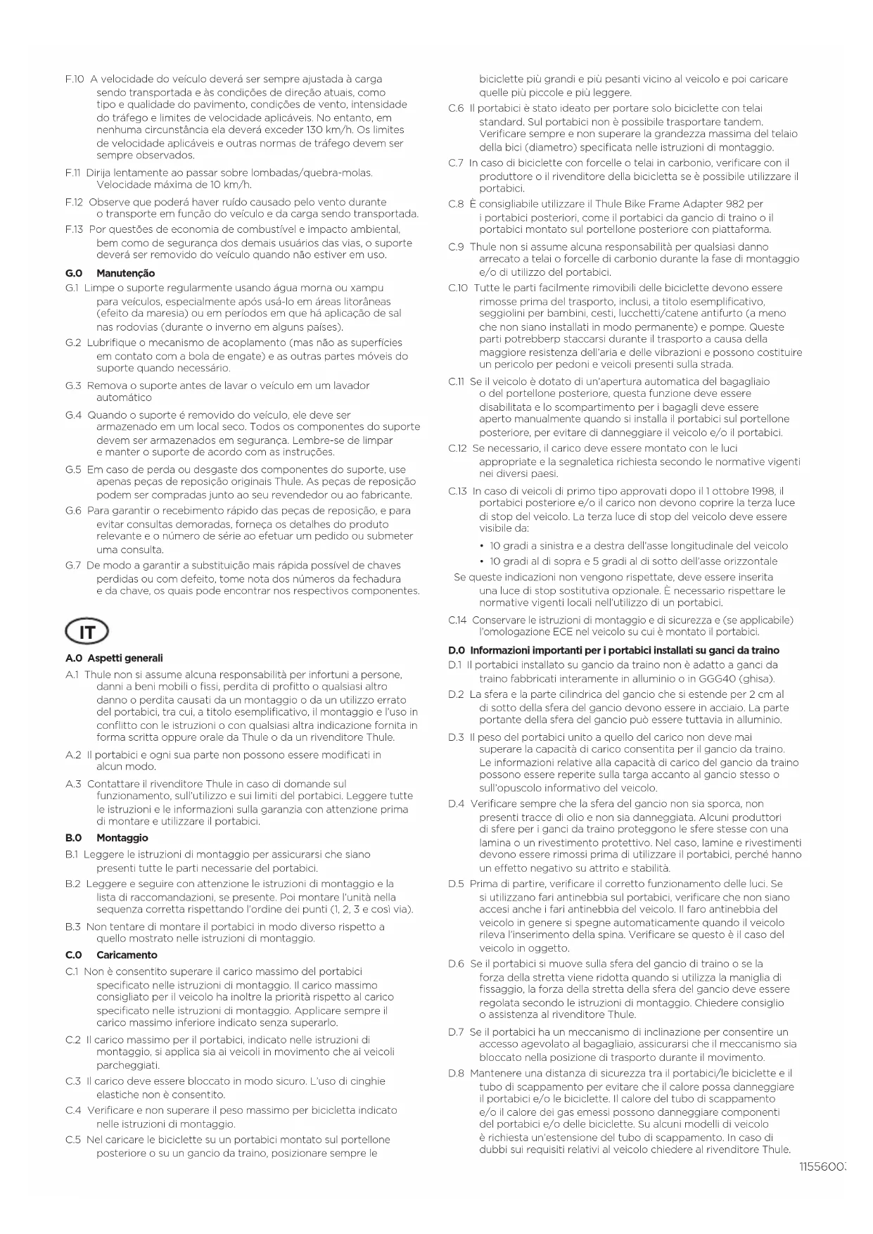 A.0 Aspetti generali A.1 Thule non si assume alcuna responsabilità per infortuni a persone, danni a beni mobili o fissi, perdita di profitto o qualsiasi altro danno o perdita causati da un montaggio o da un utilizzo errato del portabici, tra cui, a titolo esemplificativo, il montaggio e l’uso in conflitto con le istruzioni o con qualsiasi altra indicazione fornita in forma scritta oppure orale da Thule o da un rivenditore Thule. A.2 Il portabici e ogni sua parte non possono essere modificati in alcun modo. A.3 Contattare il rivenditore Thule in caso di domande sul funzionamento, sull’utilizzo e sui limiti del portabici. Leggere tutte le istruzioni e le informazioni sulla garanzia con attenzione prima di montare e utilizzare il portabici. B.0 Montaggio B.1 Leggere le istruzioni di montaggio per assicurarsi che siano presenti tutte le parti necessarie del portabici. B.2 Leggere e seguire con attenzione le istruzioni di montaggio e la lista di raccomandazioni, se presente. Poi montare l’unità nella sequenza corretta rispettando l’ordine dei punti (1, 2, 3 e così via). B.3 Non tentare di montare il portabici in modo diverso rispetto a quello mostrato nelle istruzioni di montaggio. C.0 Caricamento C.1 Non è consentito superare il carico massimo del portabici specificato nelle istruzioni di montaggio. Il carico massimo consigliato per il veicolo ha inoltre la priorità rispetto al carico specificato nelle istruzioni di montaggio. Applicare sempre il carico massimo inferiore indicato senza superarlo. C.2 Il carico massimo per il portabici, indicato nelle istruzioni di montaggio, si applica sia ai veicoli in movimento che ai veicoli parcheggiati. C.3 Il carico deve essere bloccato in modo sicuro. L’uso di cinghie elastiche non è consentito. C.4 Verificare e non superare il peso massimo per bicicletta indicato nelle istruzioni di montaggio. C.5 Nel caricare le biciclette su un portabici montato sul portellone posteriore o su un gancio da traino, posizionare sempre le biciclette più grandi e più pesanti vicino al veicolo e poi caricare quelle più piccole e più leggere. C.6 Il portabici è stato ideato per portare solo biciclette con telai standard. Sul portabici non è possibile trasportare tandem. Verificare sempre e non superare la grandezza massima del telaio della bici (diametro) specificata nelle istruzioni di montaggio. C.7 In caso di biciclette con forcelle o telai in carbonio, verificare con il produttore o il rivenditore della bicicletta se è possibile utilizzare il portabici. C.8 È consigliabile utilizzare il Thule Bike Frame Adapter 982 per i portabici posteriori, come il portabici da gancio di traino o il portabici montato sul portellone posteriore con piattaforma. C.9 Thule non si assume alcuna responsabilità per qualsiasi danno arrecato a telai o forcelle di carbonio durante la fase di montaggio e/o di utilizzo del portabici. C.10 Tutte le parti facilmente rimovibili delle biciclette devono essere rimosse prima del trasporto, inclusi, a titolo esemplificativo, seggiolini per bambini, cesti, lucchetti/catene antifurto (a meno che non siano installati in modo permanente) e pompe. Queste parti potrebberp staccarsi durante il trasporto a causa della maggiore resistenza dell’aria e delle vibrazioni e possono costituire un pericolo per pedoni e veicoli presenti sulla strada. C.11 Se il veicolo è dotato di un’apertura automatica del bagagliaio o del portellone posteriore, questa funzione deve essere disabilitata e lo scompartimento per i bagagli deve essere aperto manualmente quando si installa il portabici sul portellone posteriore, per evitare di danneggiare il veicolo e/o il portabici. C.12 Se necessario, il carico deve essere montato con le luci appropriate e la segnaletica richiesta secondo le normative vigenti nei diversi paesi. C.13 In caso di veicoli di primo tipo approvati dopo il 1 ottobre 1998, il portabici posteriore e/o il carico non devono coprire la terza luce di stop del veicolo. La terza luce di stop del veicolo deve essere visibile da: