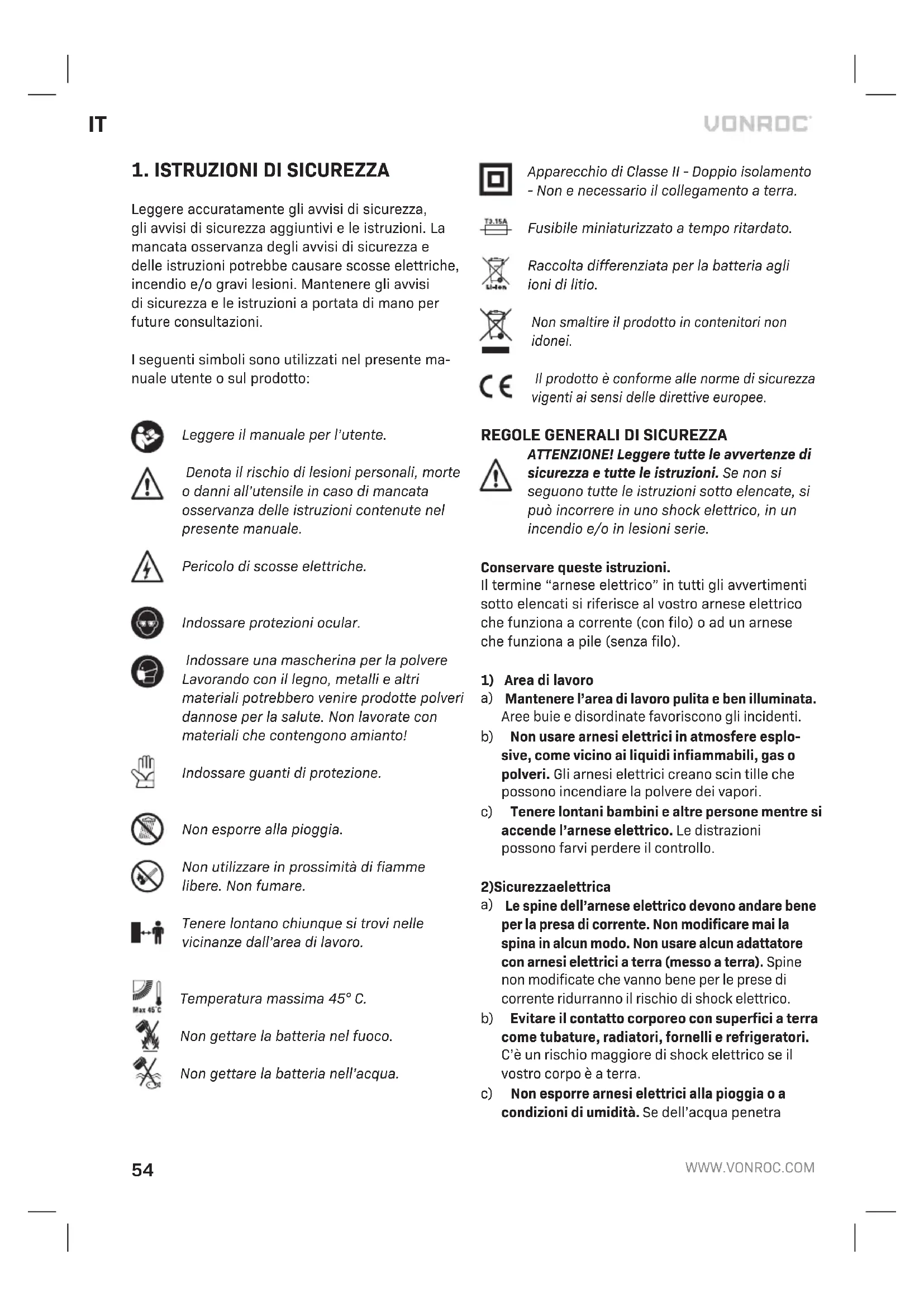 Sono state utilizzate parti di ricambio non originali Ciò costituisce l’unica garanzia espressa o implicita fornita dall’azienda. Non esistono altre garanzie espresse o implicite che si estendono oltre il presente documento, ivi comprese le garanzie im- plicite di commerciabilità e idoneità per uno scopo particolare. In nessun caso VONROC sarà responsa- bile di eventuali danni incidentali o consequenziali. I rimedi dei rivenditori saranno limitati alla ripara- zione o sostituzione di unità o parti non conformi. Il prodotto e il manuale per l’utente sono soggetti a modifiche. I dati tecnici possono essere modificati senza ulteriore notifica.