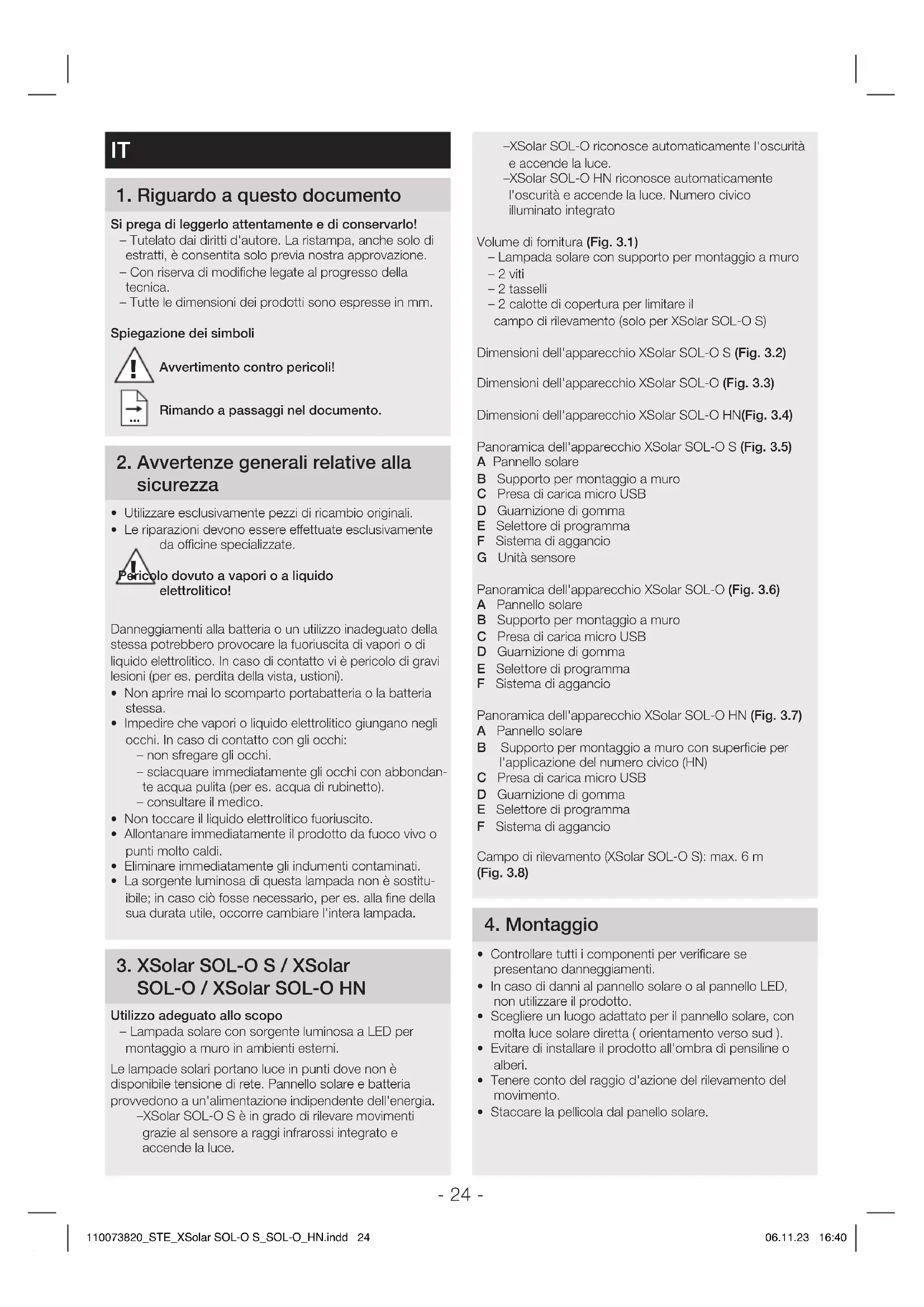 110073820_STE_XSolar SOL-O S_SOL-O_HN.indd 27110073820_STE_XSolar SOL-O S_SOL-O_HN.indd 27 06.11.23 16:4006.11.23 16:40- 28 - Guasto Causa Rimedio Il LED rosso lampeggia nel sensore di movimento/nella lampada ■ La capacità della batteria è troppo ridotta ■ Caricare la batteria con un adattatore di carica micro USB La lampada non si accende ■ La capacità della batteria è troppo ridotta ■ Campo di rilevamento non impostato con direzione giusta ■ Caricare la batteria con un adattatore di carica micro USB ■ Controllare il campo di rilevamento La lampada non si spegne ■ Movimento continuo nel campo di rilevamento ■ Controllare il campo di rilevamento La lampada si accende a sproposito ■ Movimento incontrollato all'interno del campo di rilevamento: il vento muove alberi e cespugli nel campo di rilevamento. Vengono rilevati veicoli sulla strada. Improvvisi sbalzi di temperatura dovuti a condizioni atmosferiche (vento pioggia, neve) o causati da aria di scarico di ventilatori o da aria proveniente da finestre aperte. ■ La lampada vacilla (si muove) per es. in seguito a boe di vento o a forte precipitazione ■ Controllare il campo di rilevamento ■ Montare la lampada su una base stabile La batteria non si carica ■ Il pannello solare è sporco ■ Il luogo d'installazione del pannello solare non è adeguato. ■ Pulire il pannello solare con un panno morbido e un detergente delicato ■ Controllare il luogo d'installazione (deve essere per quanto possibile esposto alla luce solare diretta) Pericolo di danni a cose in caso di non utilizzo prolungato ■ Se la lampada non viene utilizzata per un periodo prolungato (per es. se viene messa a magazzino) la batteria si potrebbe distruggere in seguito a scarica profonda ■ Impostare il selettore di programma su P0 risp. OFF ■ Prima di una sospensione prolungata dell'utilizzo, caricare completamente l'accumulatore ■ Durante il periodo di non utilizzo, caricare periodicamente l'accumulatore 11 Disturbi di funzionamento 110073820_STE_XSolar SOL-O S_SOL-O_HN.indd 28110073820_STE_XSolar SOL-O S_SOL-O_HN.indd 28 06.11.23 16:4006.11.23 16:40- 29 - – XSolar SOL-O HN detecta automáticamente la oscuridad y enciende la luz. Número de casa iluminado integrado.Volumen de suministro (Fig 31) – Lámpara solar con soporte de pared – 2 tornillos – 2 espigas – 2 cubiertas para limitar el campo de detección (Solo XSolarSOL-OS)Dimensiones del producto XSolarSOL-OS (Fig 32)Dimensiones del producto XSolarSOL-O (Fig 33)Dimensiones del producto XSolar SOL-OHN (Fig 34)Visión general del equipo XSolar SOL-OS (Fig 35)A Panel solarB Soporte de paredC Conector de carga micro-USBD Junta de gomaE Selector de programaF CierreG Unidad del sensorVisión general del equipo XSolarSOL-O (Fig 36)A Panel solarB Soporte de paredC Conector de carga micro-USBD Junta de gomaE Selector de programaF CierreVisión general del equipo XSolarSOL-OHN (Fig 37)A Panel solarB Soporte de pared con área luminosa para número de casa (HN)C Conector de carga micro-USBD Junta de gomaE Selector de programaF CierreCampo de detección (XSolarSOL-OS): máx. 6m (Fig 38) 4 Montaje