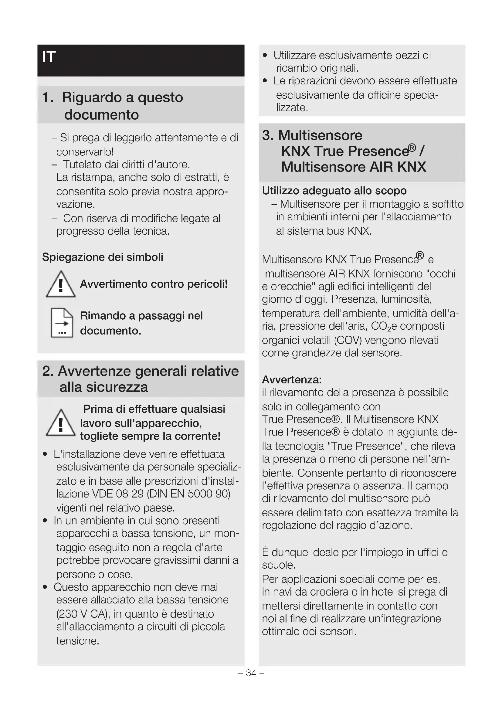 multisensore AIR KNX forniscono "occhi e orecchie" agli edifici intelligenti del giorno d'oggi. Presenza, luminosità, temperatura dell'ambiente, umidità dell'a- ria, pressione dell'aria, CO₂e composti organici volatili (COV) vengono rilevati come grandezze dal sensore. Avvertenza: il rilevamento della presenza è possibile solo in collegamento con TruePresence®. Il Multisensore KNX True Presence® è dotato in aggiunta de- lla tecnologia "TruePresence", che rileva la presenza o meno di persone nell’am- biente. Consente pertanto di riconoscere l’eettiva presenza o assenza. Il campo di rilevamento del multisensore può essere delimitato con esattezza tramite la regolazione del raggio d’azione. È dunque ideale per l‘impiego in uci e scuole. Per applicazioni speciali come per es. in navi da crociera o in hotel si prega di mettersi direttamente in contatto con noi al fine di realizzare un‘integrazione ottimale dei sensori.– 34 – – 35 –