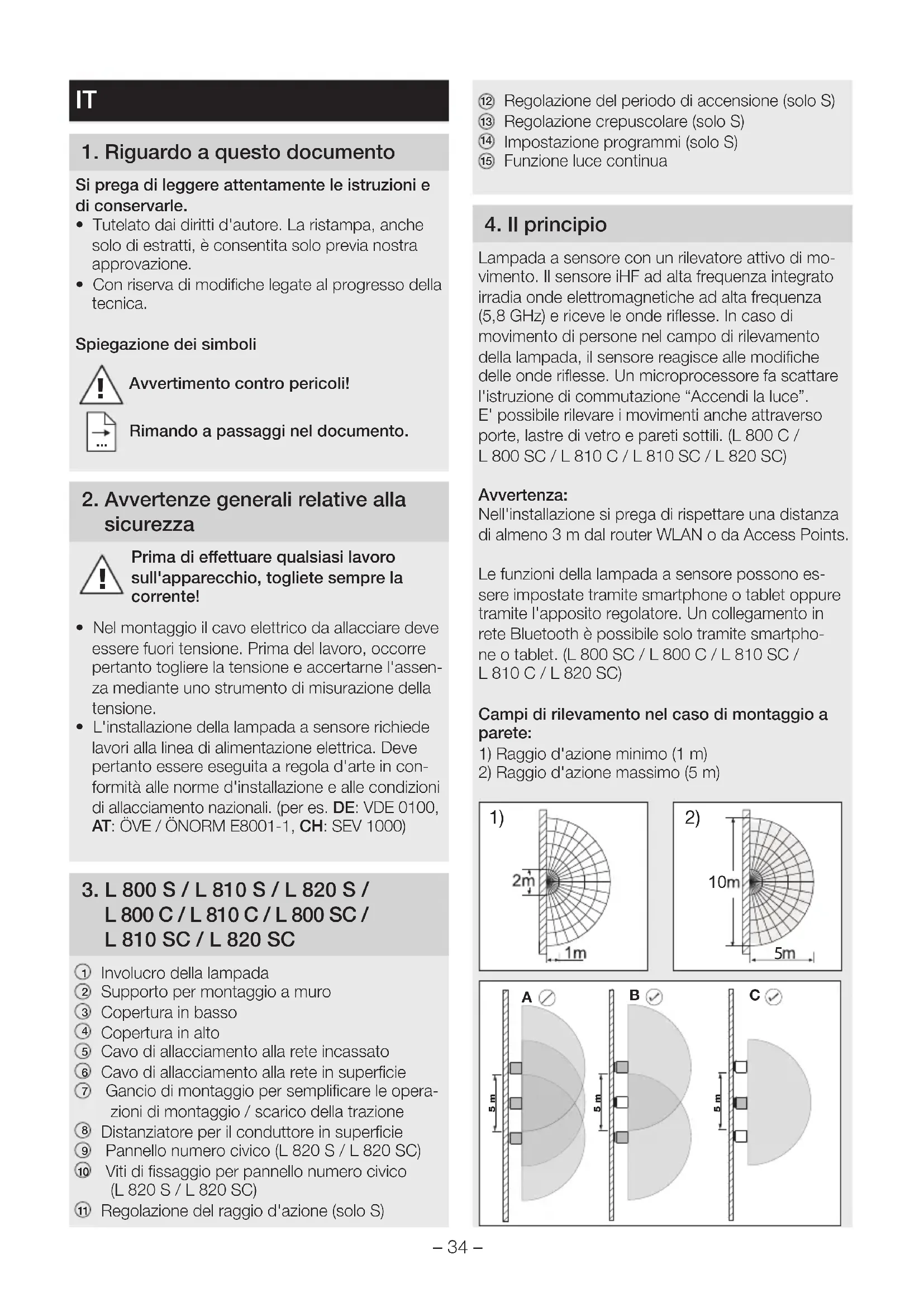 Involucro della lampada Supporto per montaggio a muro Copertura in basso Copertura in alto Cavo di allacciamento alla rete incassato Cavo di allacciamento alla rete in superficie Gancio di montaggio per semplificare le opera-zioni di montaggio / scarico della trazione Distanziatore per il conduttore in superficie Pannello numero civico (L820S / L820SC) Viti di fissaggio per pannello numero civico (L820S / L820SC) Regolazione del raggio d'azione (solo S)– 35 – Avvertenza: Se le lampade vengono montate troppo vicine le une alle altre, si potrebbero verificare interventi a sproposito, in quanto i segnali ad alta frequenza trasmessi interferiscono tra loro (Fig. A). I seguenti accorgimenti aiutano a evitare questo errore: