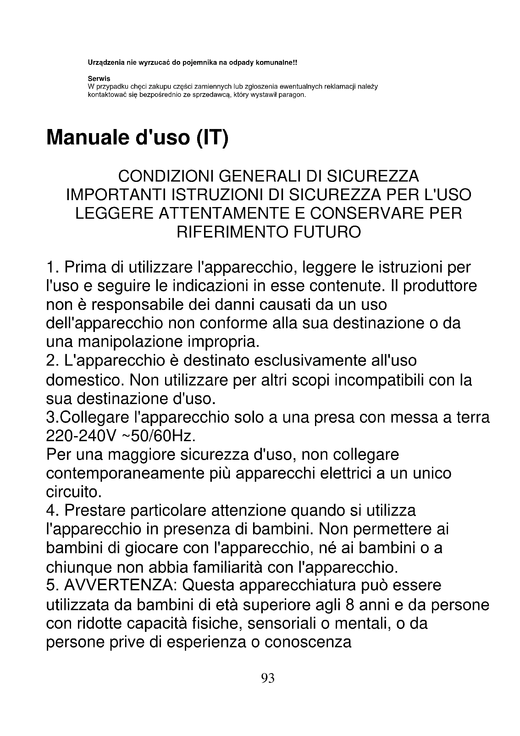 l'uso e seguire le indicazioni in esse contenute. Il produttore non è responsabile dei danni causati da un uso dell'apparecchio non conforme alla sua destinazione o da una manipolazione impropria.