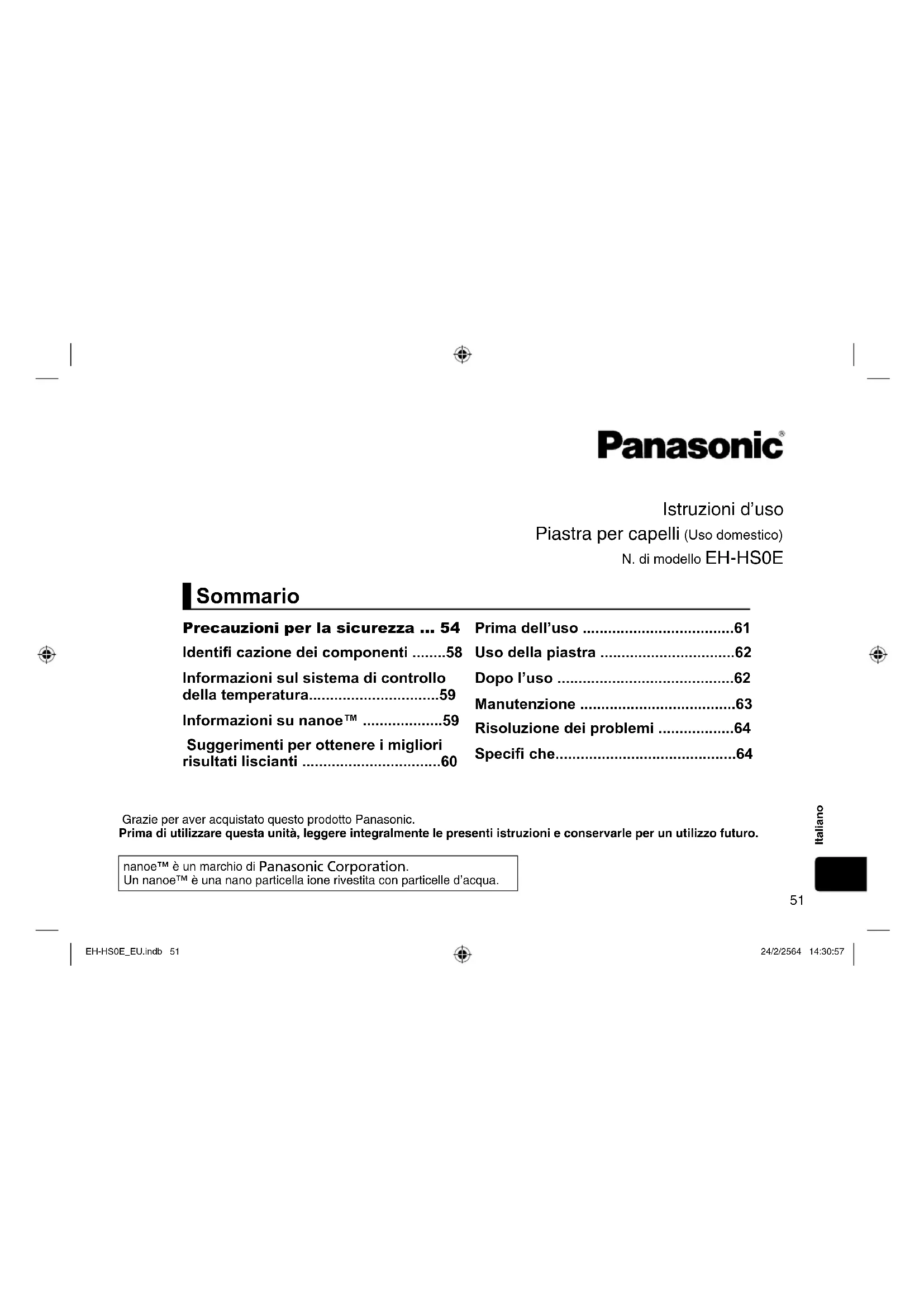 Scarica le istruzioni per il tuo Piastra per capelli in formato PDF gratuitamente! Trova il tuo manuale EHHS0E - PANASONIC e riprendi in mano il tuo dispositivo elettronico. In questa pagina sono pubblicati tutti i documenti necessari per l'utilizzo del tuo dispositivo. EHHS0E del marchio PANASONIC.
