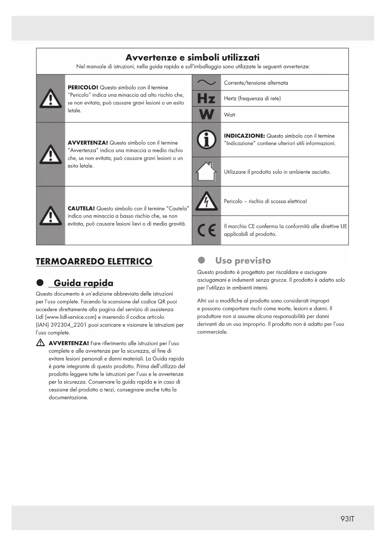 [8] [1] ≥ 60 cm [9] [9]92 IT Avvertenze e simboli utilizzati................................... . . Pagina 93 Guida rapida ....................................................... . . Pagina 93 Uso previsto .......................................................... . . Pagina 93 Descrizione dei componenti.............................................. . . Pagina 94 Dati tecnici ........................................................... . . Pagina 95 Istruzioni di sicurezza ............................................. . . Pagina 95 Montaggio.......................................................... . . Pagina 98 Libera installazione .................................................... . . Pagina 98 Montaggio a parete.................................................... . . Pagina 98 Funzionamento .................................................... . . Pagina 98 Pulizia e manutenzione ........................................... . . Pagina 98 Smaltimento........................................................ . . Pagina 98 Assistenza .......................................................... . . Pagina 99 Disegno di montaggio– libera installazione................... . . Pagina 100 Disegno di montaggio– montaggio a parete ................. . . Pagina 10193IT Avvertenze e simboli utilizzati Nel manuale di istruzioni, nella guida rapida e sull’imballaggio sono utilizzate le seguenti avvertenze: PERICOLO! Questo simbolo con il termine “Pericolo” indica una minaccia ad alto rischio che, se non evitata, può causare gravi lesioni o un esito letale. Corrente/tensione alternata Hertz (frequenza di rete) Watt AVVERTENZA! Questo simbolo con il termine “Avvertenza” indica una minaccia a medio rischio che, se non evitata, può causare gravi lesioni o un esito letale. INDICAZIONE: Questo simbolo con il termine “Indicazione” contiene ulteriori utili informazioni. Utilizzare il prodotto solo in ambiente asciutto. CAUTELA! Questo simbolo con il termine “Cautela” indica una minaccia a basso rischio che, se non evitata, può causare lesioni lievi o di media gravità. Pericolo–rischio di scossa elettrica! Il marchio CE conferma la conformità alle direttive UE applicabili al prodotto. TERMOARREDO ELETTRICO Guida rapida Questo documento è un’edizione abbreviata delle istruzioni per l’uso complete. Facendo la scansione del codice QR puoi accedere direttamente alla pagina del servizio di assistenza Lidl (www.lidl-service.com) e inserendo il codice articolo (IAN)392304_2201 puoi scaricare e visionare le istruzioni per l’uso complete.