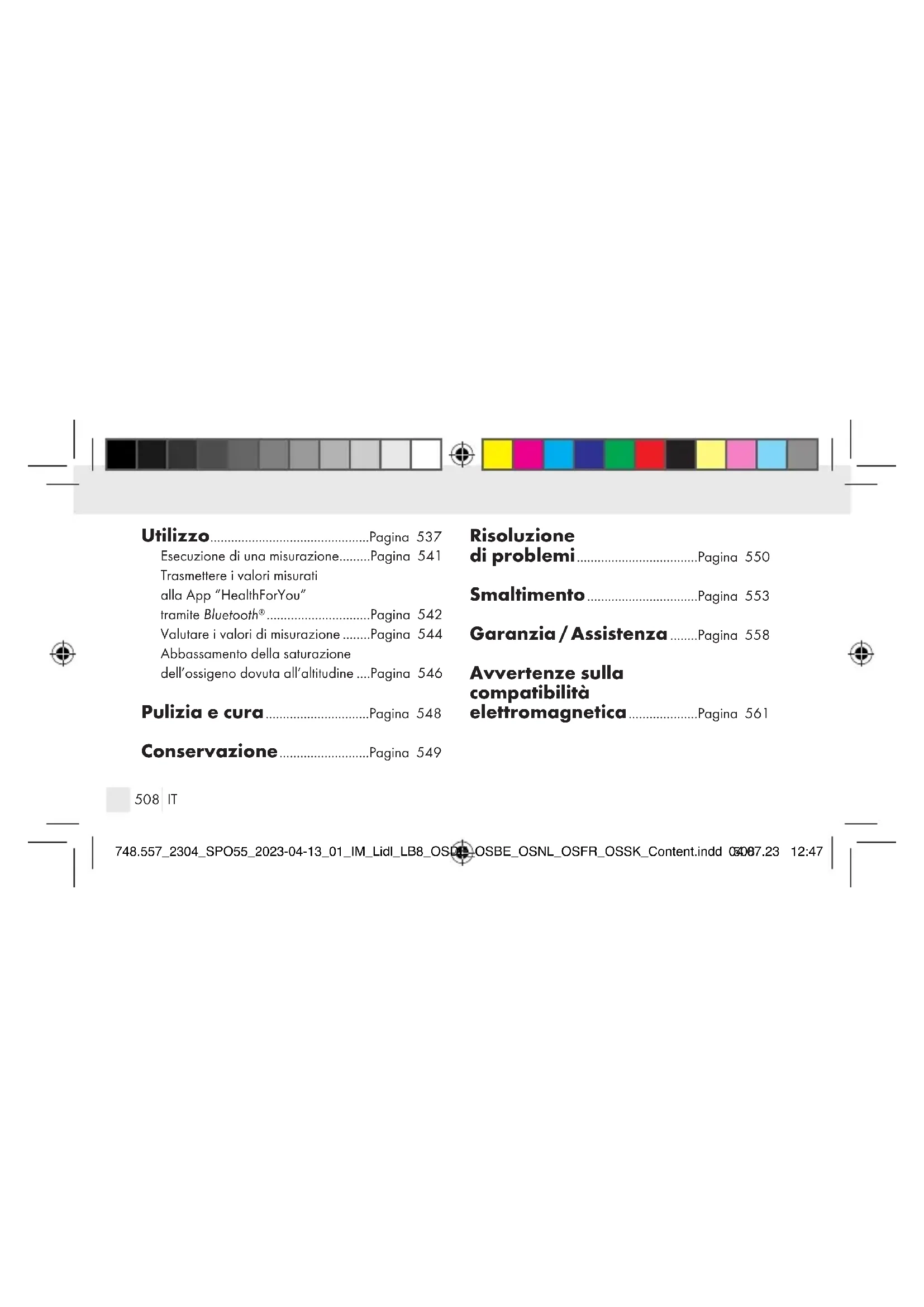 ..............................Pagina 542 Valutare i valori di misurazione ........Pagina 544 Abbassamento della saturazione dell’ossigeno dovuta all’altitudine ....Pagina 546 Pulizia e cura ..............................Pagina 548 Conservazione ..........................Pagina 549 Risoluzione di problemi ...................................Pagina 550 Smaltimento ................................Pagina 553 Garanzia / Assistenza ........Pagina 558 Avvertenze sulla compatibilità elettromagnetica ....................Pagina 561 748.557_2304_SPO55_2023-04-13_01_IM_Lidl_LB8_OSDE_OSBE_OSNL_OSFR_OSSK_Content.indd 508748.557_2304_SPO55_2023-04-13_01_IM_Lidl_LB8_OSDE_OSBE_OSNL_OSFR_OSSK_Content.indd 50804.07.23 12:4704.07.23 12:47509 IT Legenda dei pittogrammi utilizzati ATTENZIONE Avvertenza circa un rischio di lesione o di pericolo per la propria salute Attenersi alle istruzioni Leggere le istruzioni prima dell’inizio del lavoro e/o dell’uso degli appa- recchi o delle macchine. 748.557_2304_SPO55_2023-04-13_01_IM_Lidl_LB8_OSDE_OSBE_OSNL_OSFR_OSSK_Content.indd 509748.557_2304_SPO55_2023-04-13_01_IM_Lidl_LB8_OSDE_OSBE_OSNL_OSFR_OSSK_Content.indd 50904.07.23 12:4704.07.23 12:47510 IT Legenda dei pittogrammi utilizzati ATTENZIONE Questo simbolo indica che è neces- saria cautela quando si impiegano gli apparecchi o i regolatori vicini a questo simbolo, oppure che la situazione attuale richiede attenzione o intervento da parte dell’utente per evitare conseguenze indesiderate. %SpO₂