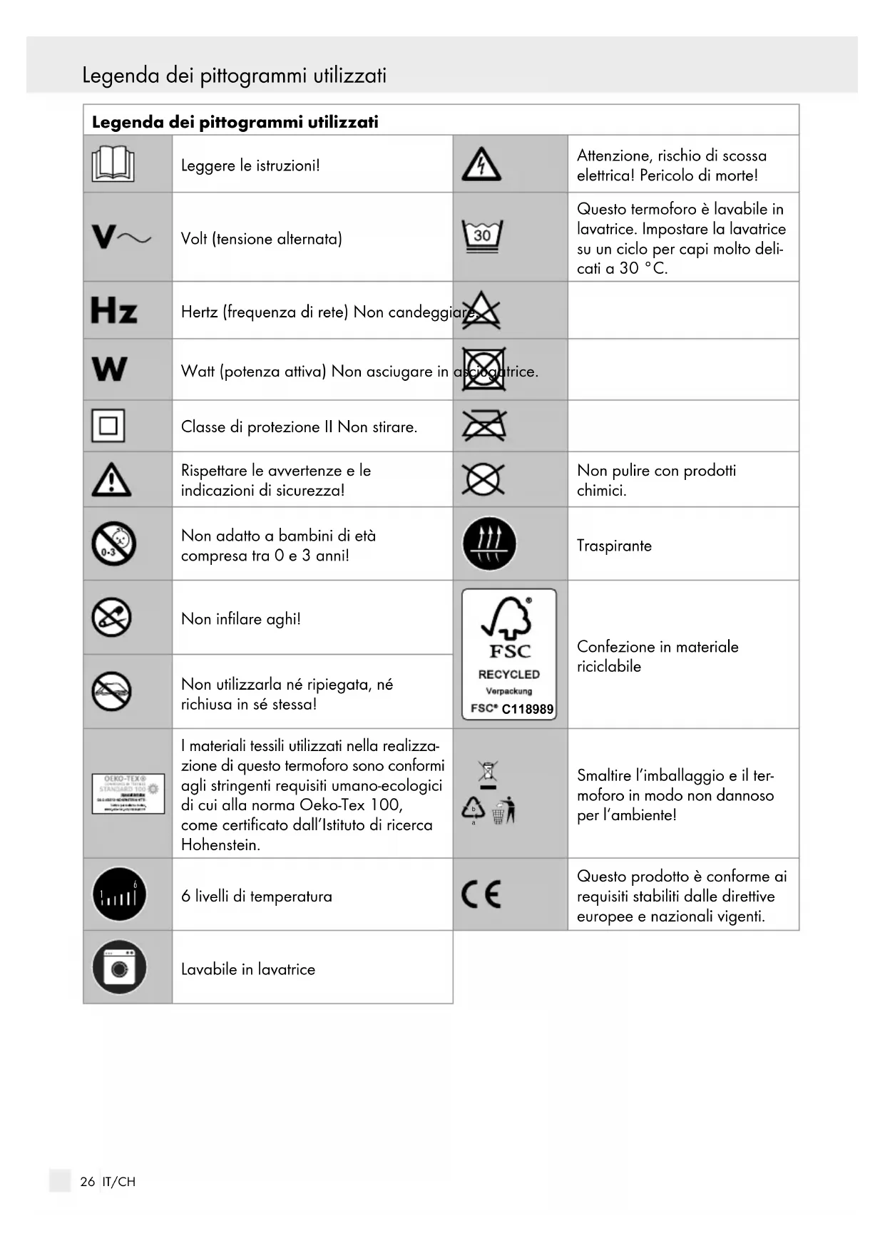 6 livelli di temperatura Questo prodotto è conforme ai requisiti stabiliti dalle direttive europee e nazionali vigenti. Lavabile in lavatrice Introduzione27 IT/CH Legenda dei pittogrammi utilizzati Introduzione Termoforo per spalle e nuca Introduzione Familiarizzare con il termoforo prima di accenderlo e di utilizzarlo per la prima volta. A questo scopo leggere attenta- mente le seguenti istruzioni d‘uso e le indicazioni di sicurezza importanti. Utilizzare il termoforo solamente come descritto e per gli ambiti indicati. Custodire queste istruzioni. In caso di passaggio del termoforo a terzi, consegnare anche tutta la documentazione. Utilizzo conforme Questo termoforo è destinato al riscaldamento del corpo umano. Esso consente l‘applicazione mirata del calore nella zona delle spalle. Il presente ter- moforo non è concepito per l‘uso negli ospedali o per scopi commerciali. In particolare è vietato riscal- dare neonati, bambini piccoli, persone insensibili al calore o non autosufficienti nonché animali. Un uti- lizzo diverso da quello precedentemente descritto o una modifica del termoforo non sono ammessi e possono provocare lesioni a persone e / o danneg- giamenti dello stesso termoforo. Il produttore non si assume alcuna responsabilità per eventuali danni determinati da un utilizzo non conforme alle indica- zioni fornite. Descrizione dei componenti