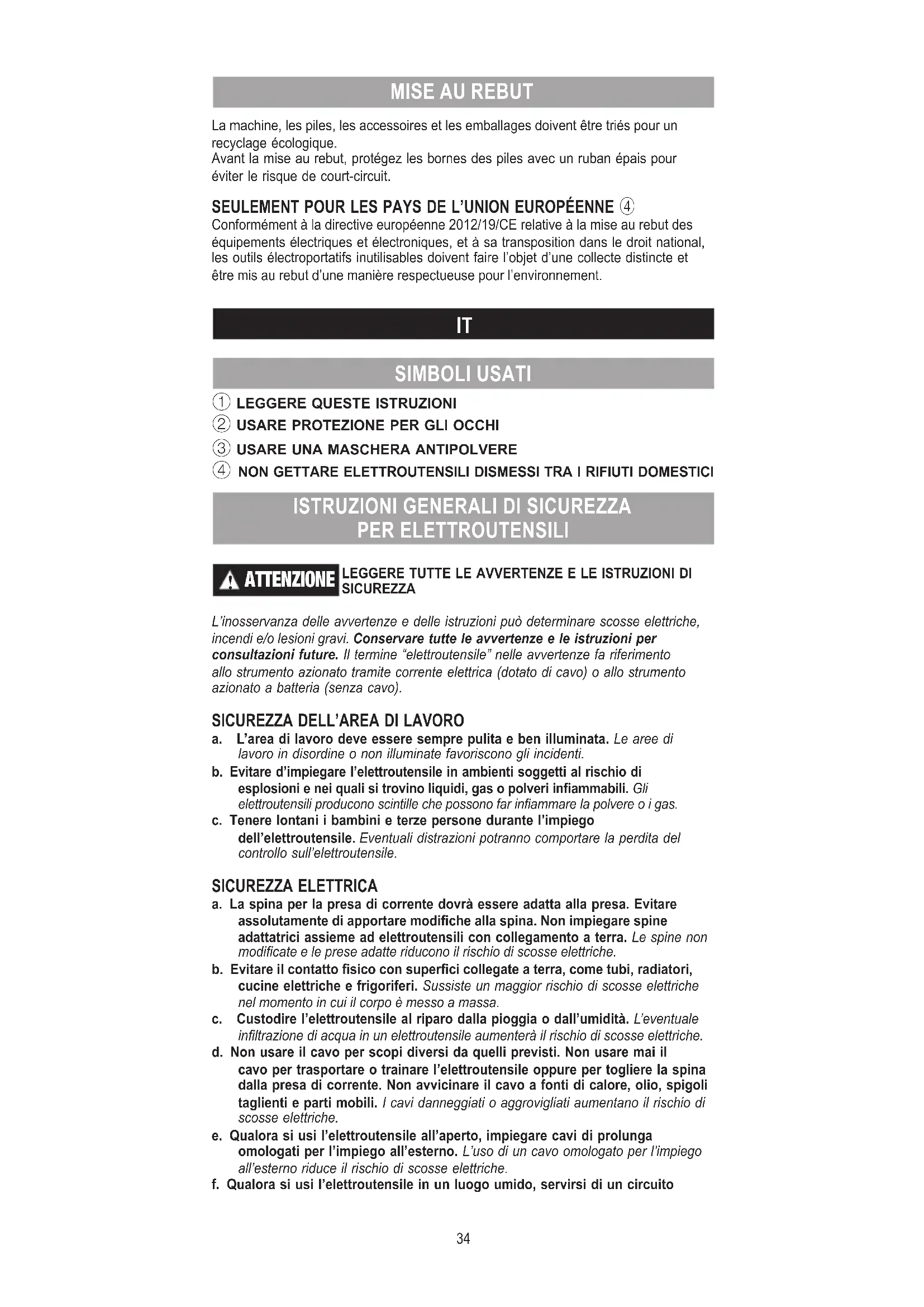 ATTENZIONE LEGGERE TUTTE LE AVVERTENZE E LE ISTRUZIONI DI SICUREZZA L’inosservanza delle avvertenze e delle istruzioni può determinare scosse elettriche, incendi e/o lesioni gravi. Conservare tutte le avvertenze e le istruzioni per consultazioni future. Il termine “elettroutensile” nelle avvertenze fa riferimento allo strumento azionato tramite corrente elettrica (dotato di cavo) o allo strumento azionato a batteria (senza cavo).