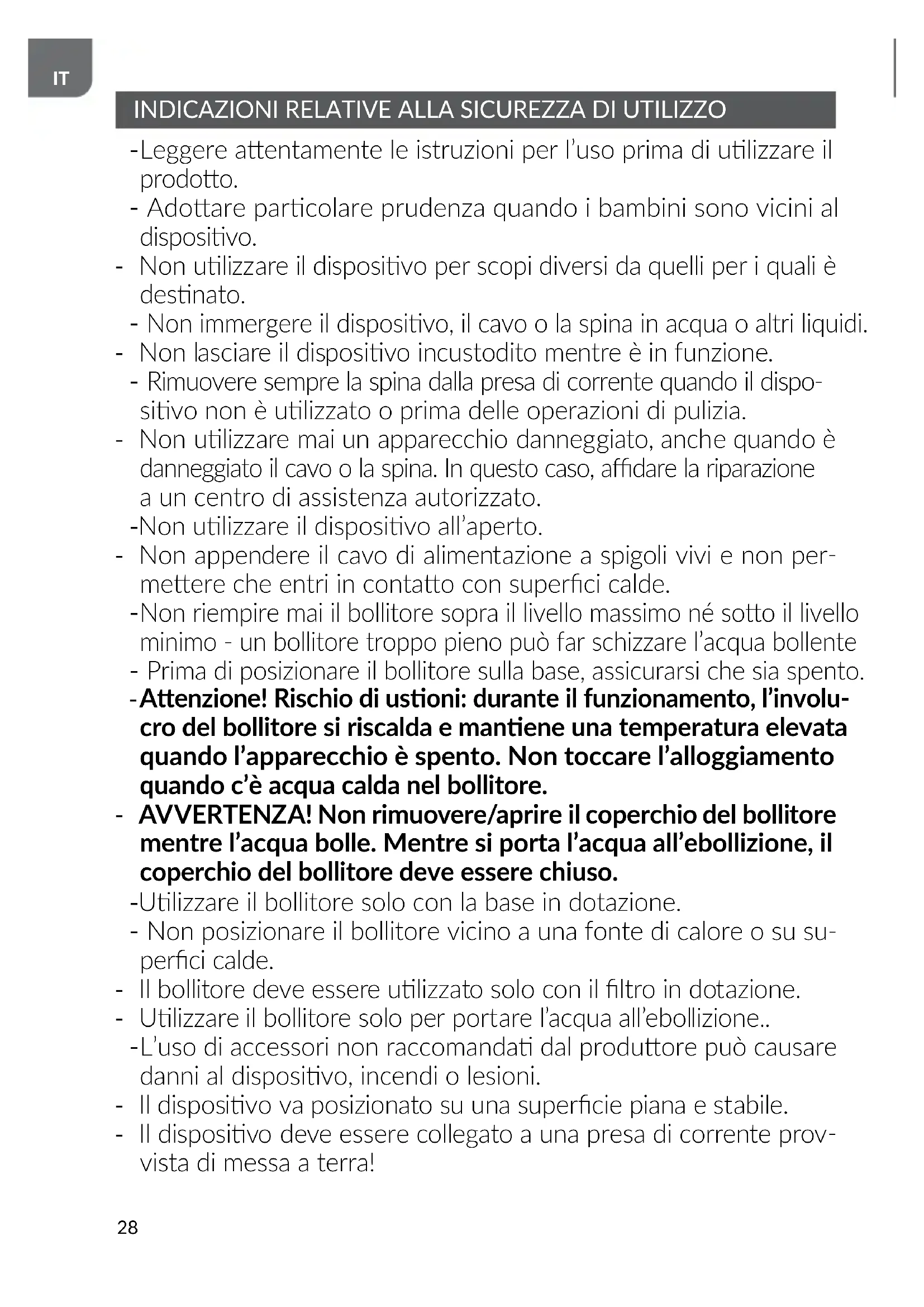 Questo disposivo può essere ulizzato da bambini dagli 8 anni in poi o da persone con capacità siche e mentali ridoe e con mancanza di esperienza e conoscenza dell’arezzatura, qualora venga fornita una supervisione o un’istruzione sull’uso sicuro dell’arezzatura, in modo tale che i pericoli correla siano chiaramente compresi. La pulizia e la manutenzione non devono essere eseguite da bam- bini a meno che non abbiano almeno 8 anni e siano sorveglia. I bambini non sono autorizza a eseguire la pulizia/manutenzione senza supervisione. - I bambini non devono giocare con l’apparecchio. - Tenere l’apparecchio e il suo cavo fuori dalla portata dei bambini al di soo degli 8 anni. - Non estrarre la spina dalla presa di corrente rando il cavo. - In caso di allagamento dei componen elerici interni, così come della base di alimentazione, asciugarli accuratamente prima di riaccendere il bollitore. - Non accendere il bollitore senza acqua.