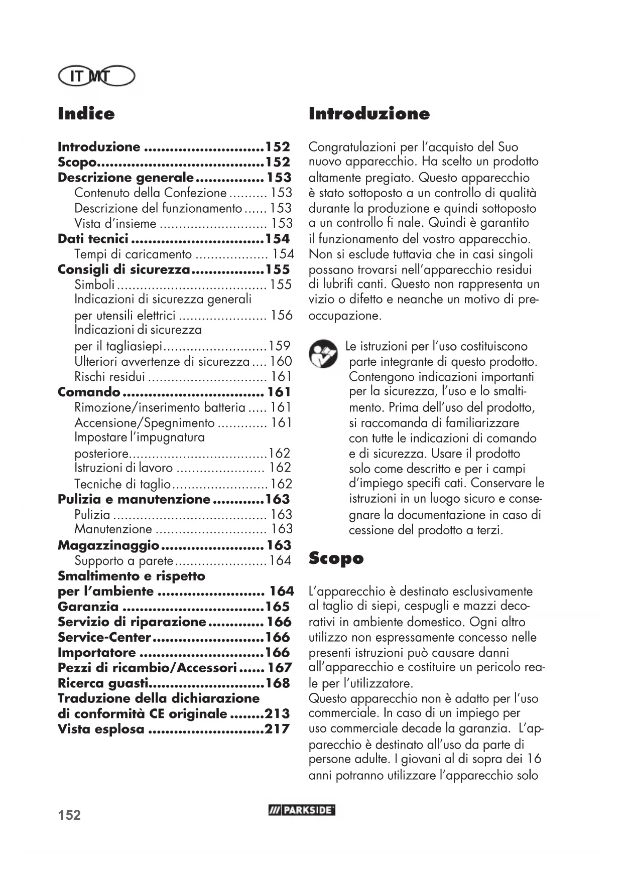 - Introduzione Congratulazioni per l’acquisto del Suo nuovo apparecchio. Ha scelto un prodotto altamente pregiato. Questo apparecchio è stato sottoposto a un controllo di qualità durante la produzione e quindi sottoposto a un controllo nale. Quindi è garantito il funzionamento del vostro apparecchio. Non si esclude tuttavia che in casi singoli possano trovarsi nell’apparecchio residui di lubri canti. Questo non rappresenta un vizio o difetto e neanche un motivo di pre- occupazione. Le istruzioni per l’uso costituiscono parte integrante di questo prodotto. Contengono indicazioni importanti per la sicurezza, l’uso e lo smalti- mento. Prima dell’uso del prodotto, si raccomanda di familiarizzare con tutte le indicazioni di comando e di sicurezza. Usare il prodotto solo come descritto e per i campi d’impiego speci cati. Conservare le istruzioni in un luogo sicuro e conse- gnare la documentazione in caso di cessione del prodotto a terzi. Scopo L’apparecchio è destinato esclusivamente al taglio di siepi, cespugli e mazzi deco- rativi in ambiente domestico. Ogni altro utilizzo non espressamente concesso nelle presenti istruzioni può causare danni all’apparecchio e costituire un pericolo rea- le per l’utilizzatore. Questo apparecchio non è adatto per l’uso commerciale. In caso di un impiego per uso commerciale decade la garanzia. L’ap- parecchio è destinato all’uso da parte di persone adulte. I giovani al di sopra dei 16 anni potranno utilizzare l’apparecchio solo Indice Introduzione p. 152