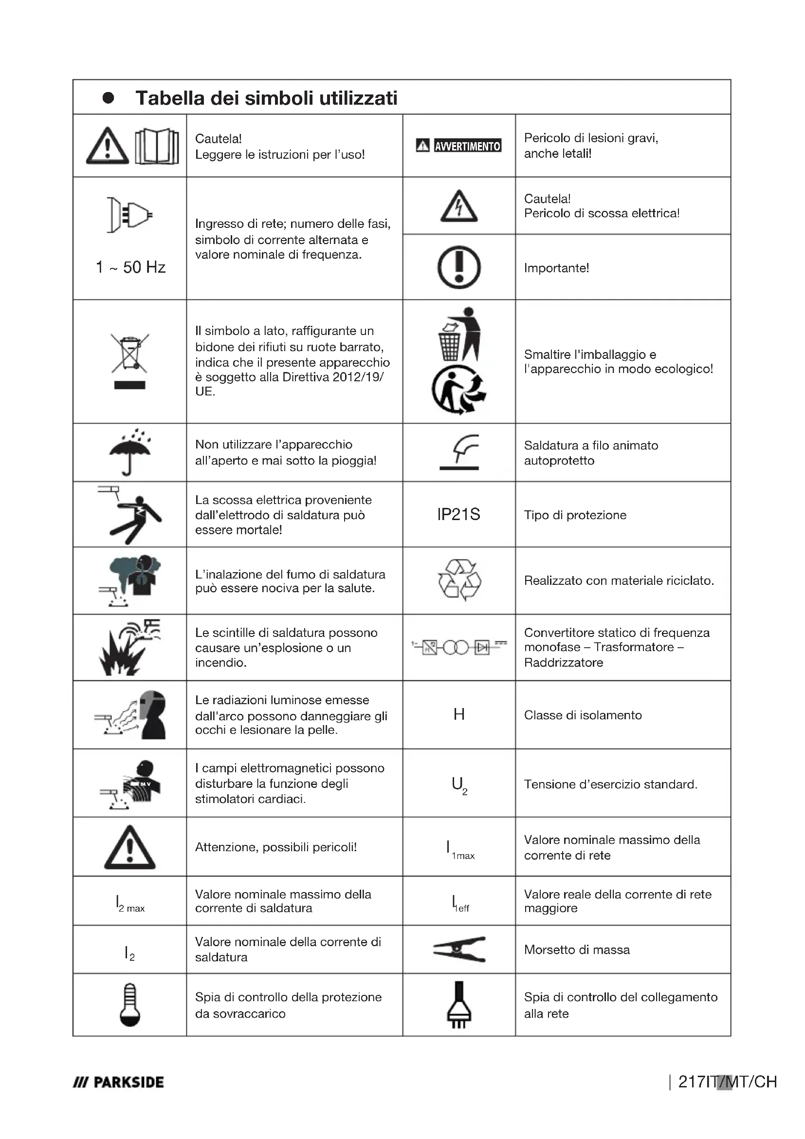 z Introduzione Congratulazioni per l'acquisto! Avete scelto un apparecchio di qualità della nostra azienda. Prima della prima messa in funzione, vi preghiamo di acquisire dimestichezza con il prodotto. A tale scopo vi preghiamo di leggere con attenzione il manuale d'uso e le istruzioni di sicurezza riportati di seguito. La messa in funzione dello strumento è consentita solo a personale appositamente formato. TENERE FUORI DALLA PORTATA DEI BAMBINI! z Uso corretto L’apparecchio è adatto alla saldatura a lo animato autoprotetto solo utilizzando il corrispondente lo. Non è necessario gas aggiuntivo. Il gas di protezione è contenuto in forma polverizzata nel lo e viene così convogliato direttamente nell'arco. Ciò rende l'apparecchio insensibile al vento quando si lavora all'aperto. Possono essere utilizzati solo elettrodi a lo adatti all’apparecchio. Parte integrante dell’uso corretto è anche l’osservanza delle istruzioni di sicurezza, così come delle istruzioni di mon- taggio e delle indicazioni sul funzionamento nel manuale d’uso. Le disposizioni antinfortunistiche in vigore devono essere rispettate con il massimo rigore. L’apparecchio non può essere usato: – in ambienti non sucientemente arieggiati, – in ambienti dove sussiste il pericolo d’esplosione, – per sgelare tubi, – nelle vicinanze di persone con stimolatori cardiaci e – nelle vicinanze di materiali facilmente inammabili. Utilizzare il prodotto solo come riportato nella descrizione e per i campi d'applicazione specicati. Conservare le presenti istruzioni in modo corretto. Fornire anche tutta la documentazione in caso di cessione del prodotto a terze parti. Qualsiasi applicazione diversa dall'uso corretto è vietata e poten- zialmente pericolosa. Gli eventuali danni provocati dal mancato rispetto delle istruzioni o da applica- zioni errate non sono coperti da garanzia e non rientrano nella sfera di responsabilità del produttore. L’apparecchio non è destinato all’uso commerciale. Un uso commerciale comporta l’annullamento della garanzia. z Oggetto della fornitura 1 saldatrice elettrica a lo PIFDS 120 B2 1 ugello del bruciatore (premontato) 4 bocchette di saldatura (1x 0,9 mm premontata; 1x 0,8 mm; 1x 0,6 mm; 1x 1,0 mm) 1 martello da saldatore con spazzola integrata 1 bobina di lo animato Ø 0,9 mm / 450 g 1 maschera protettiva 1 tracolla 1 manuale d'uso 472024_2407_Inverter-Fülldrahtschweißgerät_LB8_content.indb 218472024_2407_Inverter-Fülldrahtschweißgerät_LB8_content.indb 218 18.10.2024 10:07:0118.10.2024 10:07:01219IT/MT/CH Rischi residui Anche se si utilizza l'apparecchio secondo le disposizioni, sono sempre presenti dei rischi residui. Lastruttura e la realizzazione stesse della saldatrice a lo implicano, per loro natura, la possibilità che si verichino i seguenti pericoli: Pericolo di lesioni oculari per abbagliamento, Pericolo di ustioni da contatto con parti calde dell’apparecchio o del pezzo da saldare, Pericolo di infortunio e di incendio provocato da spruzzi di scintille o da particelle di scoria in caso di protezione inadeguata, Emissioni di fumi e gas dannose per la salute, in caso di carenza d’aria o di aspirazione insu- ciente in ambienti chiusi. Ridurre i rischi residui utilizzando l'apparecchio con prudenza, rispettando le disposizioni e attenen- dosi alle istruzioni. z Descrizione dei componenti