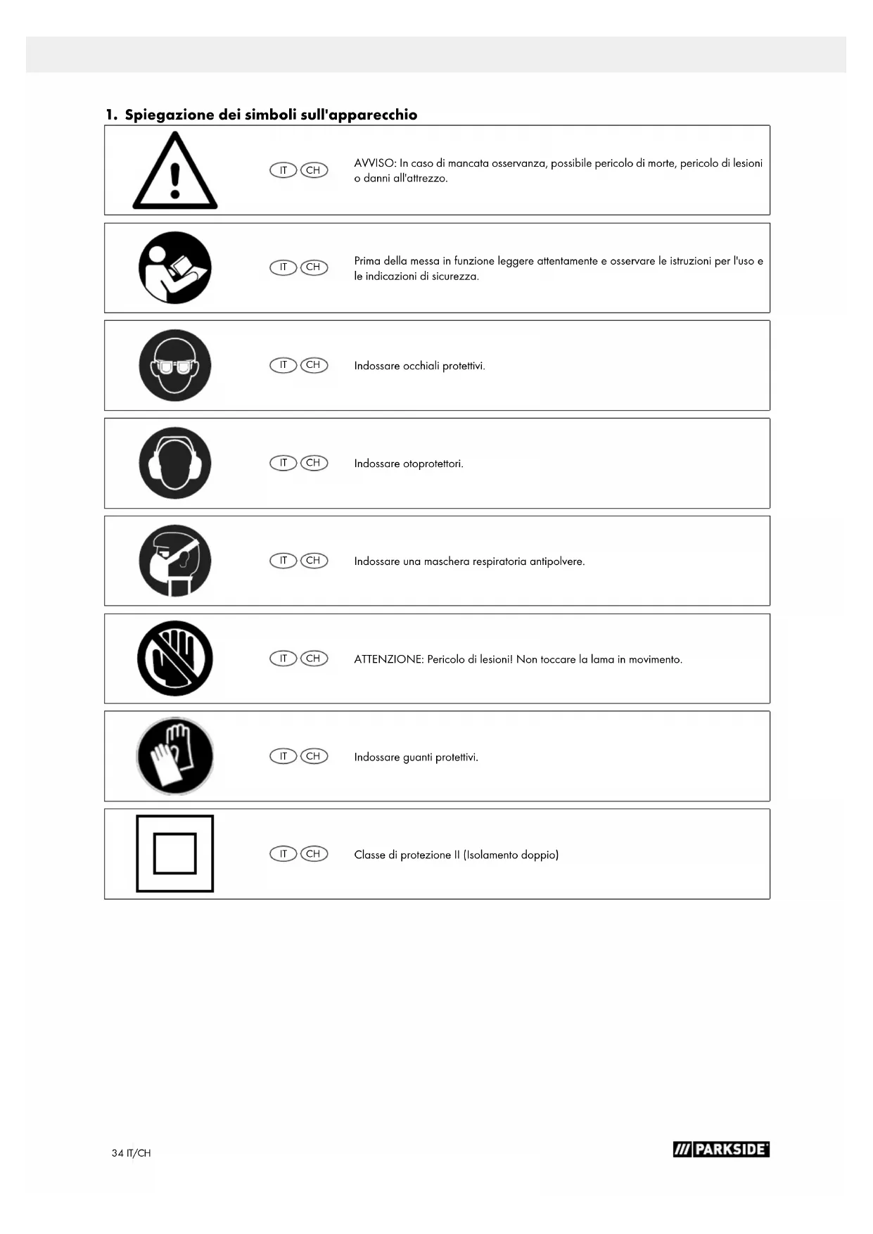 Scarica le istruzioni per il tuo Sega in formato PDF gratuitamente! Trova il tuo manuale PMTS 210 A1 - PARKSIDE e riprendi in mano il tuo dispositivo elettronico. In questa pagina sono pubblicati tutti i documenti necessari per l'utilizzo del tuo dispositivo. PMTS 210 A1 del marchio PARKSIDE.