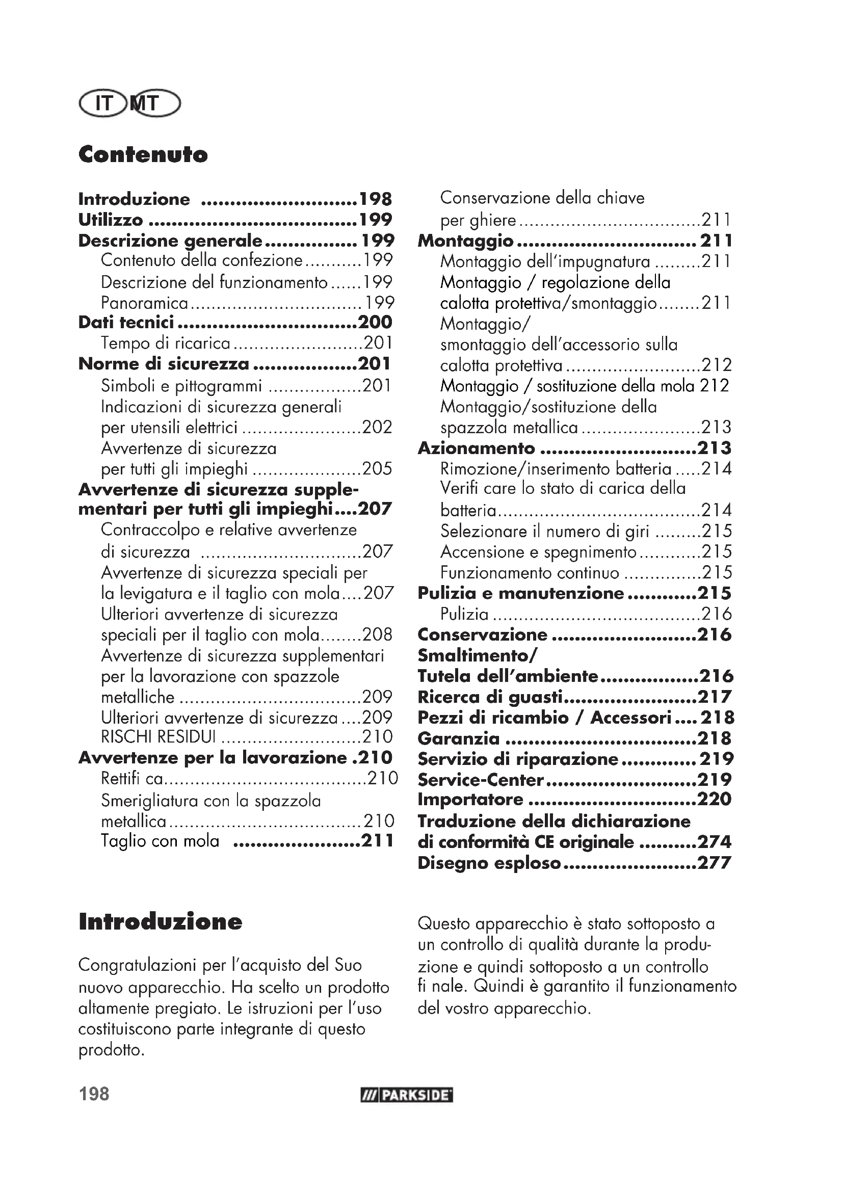 Servicio España Tel.:900984989 E-Mail: grizzly@lidl.es IAN 411383_2107 Importador Por favor, observe que la siguiente direc- ción no es una dirección de servicio. Contacteprimeramentealcentrode servicio mencionado arriba. Grizzly Tools GmbH & Co. KG Stockstädter Straße 20 63762 Großostheim Alemania www.grizzlytools.de198 IT MT Contenuto Introduzione ...........................198 Utilizzo ....................................199 Descrizione generale ................ 199 Contenutodellaconfezione ...........199 Descrizione del funzionamento ......199 Panoramica ................................. 199 Dati tecnici ...............................200 Tempodiricarica .........................201 Norme di sicurezza ..................201 Simboli e pittogrammi ..................201 Indicazioni di sicurezza generali per utensili elettrici .......................202 Avvertenze di sicurezza per tutti gli impieghi .....................205 Avvertenze di sicurezza supple- mentari per tutti gli impieghi ....207 Contraccolpoerelativeavvertenze di sicurezza ...............................207 Avvertenze di sicurezza speciali per la levigatura e il taglio con mola .... 207 Ulteriori avvertenze di sicurezza speciali per il taglio con mola ........208 Avvertenze di sicurezza supplementari per la lavorazione con spazzole metalliche ...................................209 Ulteriori avvertenze di sicurezza ....209 RISCHIRESIDUI ...........................210 Avvertenze per la lavorazione .210 Rettica.......................................210 Smerigliatura con la spazzola metallica ..................................... 210 Taglioconmola ......................211 Introduzione Congratulazioniperl’acquistodelSuo nuovo apparecchio. Ha scelto un prodotto altamente pregiato. Le istruzioni per l’uso costituiscono parte integrante di questo prodotto. Conservazionedellachiave per ghiere ...................................211 Montaggio ............................... 211 Montaggio dell‘impugnatura .........211 Montaggio / regolazione della calotta protetti va/smontaggio ........ 211 Montaggio/ smontaggio dell’accessorio sulla calotta protettiva ..........................212 Montaggio / sostituzione della mola 212 Montaggio/sostituzione della spazzola metallica .......................213 Azionamento ...........................213 Rimozione/inserimento batteria .....214 Vericarelostatodicaricadella batteria .......................................214 Selezionare il numero di giri .........215 Accensione e spegnimento ............215 Funzionamento continuo ...............215 Pulizia e manutenzione ............215 Pulizia ........................................216 Conservazione .........................216 Smaltimento/ Tutela dell’ambiente .................216 Ricerca di guasti .......................217 Pezzi di ricambio / Accessori .... 218 Garanzia .................................218 Servizio di riparazione ............. 219 Service-Center ..........................219 Importatore .............................220 Traduzione della dichiarazione di conformità CE originale ..........274 Disegno esploso .......................277 Questoapparecchioèstatosottopostoa uncontrollodiqualitàdurantelaprodu- zione e quindi sottoposto a un controllo nale.Quindiègarantitoilfunzionamento del vostro apparecchio.199 IT MT Contengonoindicazioniimportanti per la sicurezza, l’uso e lo smalti- mento. Prima dell’uso del prodotto, si raccomanda di familiarizzare con tutte le indicazioni di comando e di sicurezza. Usare il prodotto solo come descritto e per i campi d’impiegospecicati.Conservarele istruzioni in un luogo sicuro e conse- gnare la documentazione in caso di cessione del prodotto a terzi. Utilizzo Lasmerigliatriceangolareèunappa- recchio che serve a tagliare, levigare e sgrossare o spazzolare materiali di me- tallo, pietra e legno, plastica, piastrelle e metalli non ferrosi (metalli NE) senza l’uso di acqua. L‘apparecchiononèconcepitoperqualsia- si altro tipo di utilizzo (ad esempio la levi- gatura con utensili non adeguati, la leviga- tura con liquidi refrigeranti, la levigatura o il taglio di materiali nocivi come l‘amianto). È adatto all‘uso nell‘ambito di piccoli lavoridiriparazionedomestici.Nonè stato concepito per l‘impiego aziendale prolungato. L‘apparecchioèdestinatoall‘utilizzodaparte di adulti. I giovani sopra i 16 anni possono im- piegarlo solo sotto sorveglianza. Il produttore non si fa carico di eventuali danni causati da un uso improprio o da un azionamento errato. L’apparecchio fa parte della serie Parksi- deX20VTEAMefunzionamediantele batteriedellaserieParksideX20VTEAM. Le batterie possono essere caricate solo con i caricabatterie della serie Parkside X20VTEAM. Descrizione generale Le immagini si trovano sulle pagine pieghevoli anteriori e posteriori. Contenuto della confezione Rimuovere l’apparecchio dalla confezione e controllareseècompleto.Smaltireilmateri- ale di imballaggio secondo le disposizioni. - Smerigliatrice angolare ricaricabile - Impugnatura - Accessorio, calotta protettiva - Chiaveperghiere - Mola da taglio - Istruzioni per l’uso Batteria e caricabatteria non compresi nella confezione. Descrizione del funzionamento La smerigliatrice angolare serve a tagliare, levigare e sgrossare o spazzolare mate- riali di metallo, pietra e legno, plastica, piastrelle e metalli non ferrosi (metalli NE) senza l‘uso di acqua. Per i singoli impieghi sono previste mole speciali. Prestare atten- zione alle indicazioni del produttore delle mole. La seguente descrizione illustra il funziona- mento dei componenti. Panoramica 1 Impugnatura 2 Filettatura per l’impugnatura 3 Interruttore On/Off 4 Tastidisbloccaggiobatteria 5 Batteria 6 Regolatore del numero di giri 7 Calottaprotettiva 8 Mola da taglio200 IT MT 9 Tastodiarrestodelmandrino 10 Chiaveperghiere 11 Accessorio, calotta protettiva 12 Flangia di supporto 13 Dado di bloccaggio 14 Mandrino di supporto 15 Mola 16 Vite 17 Dis