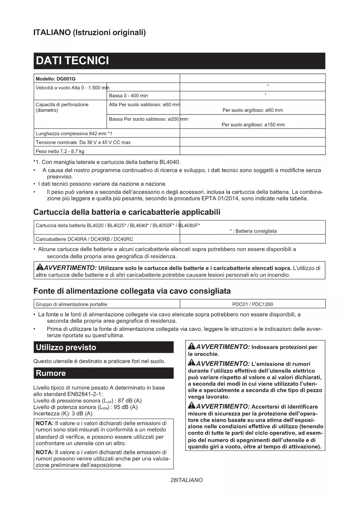 - Prima di utilizzare la fonte di alimentazione collegata via cavo, leggere le istruzioni e le indicazioni delle avver- tenze riportate su quest’ultima. Utilizzo previsto Questo utensile è destinato a praticare fori nel suolo. Rumore Livello tipico di rumore pesato A determinato in base allo standard EN62841-2-1: Livello di pressione sonora (L