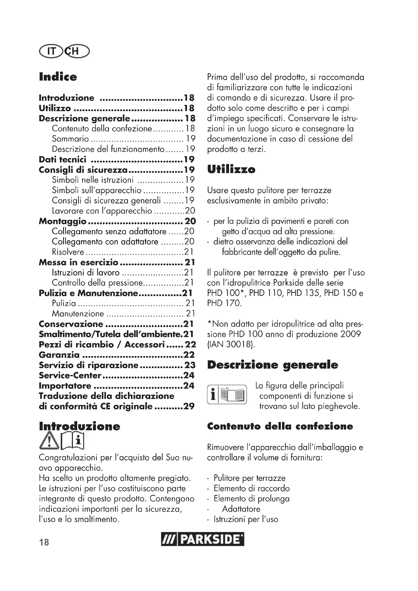 Service Swisse Tel.: 0842 665566 (0,08 CHF/Min., Mobilfunk max. 0,40 CHF/Min.) E-Mail: grizzly@lidl.ch IAN 327190_1904 Importateur Veuillez noter que l’adresse suivante n’est pas une adresse de service après-vente. Contactez d’abord le service après-vente cité plus haut. Grizzly Tools GmbH & Co. KG Stockstädter Straße 20 63762 Großostheim Allemagne www.grizzly-service.eu18 IT CH Prima dell’uso del prodotto, si raccomanda di familiarizzare con tutte le indicazioni di comando e di sicurezza. Usare il pro- dotto solo come descritto e per i campi d’impiegospecicati.Conservare le istru- zioni in un luogo sicuro e consegnare la documentazione in caso di cessione del prodotto a terzi. Utilizzo Usare questo pulitore per terrazze esclusivamente in ambito privato: - per la pulizia di pavimenti e pareti con getto d’acqua ad alta pressione. - dietro osservanza delle indicazioni del fabbricante dell’oggetto da pulire. Il pulitore per terrazze è previsto per l’uso con l’idropulitrice Parkside delle serie PHD 100*, PHD 110, PHD 135, PHD 150 e PHD 170. *Non adatto per idropulitrice ad alta pres- sione PHD 100 anno di produzione 2009 (IAN 30018). Descrizione generale Laguradelleprincipali componenti di funzione si trovano sul lato pieghevole. Contenuto della confezione Rimuovere l‘apparecchio dall‘imballaggio e controllare il volume di fornitura: - Pulitore per terrazze - Elemento di raccordo - Elemento di prolunga